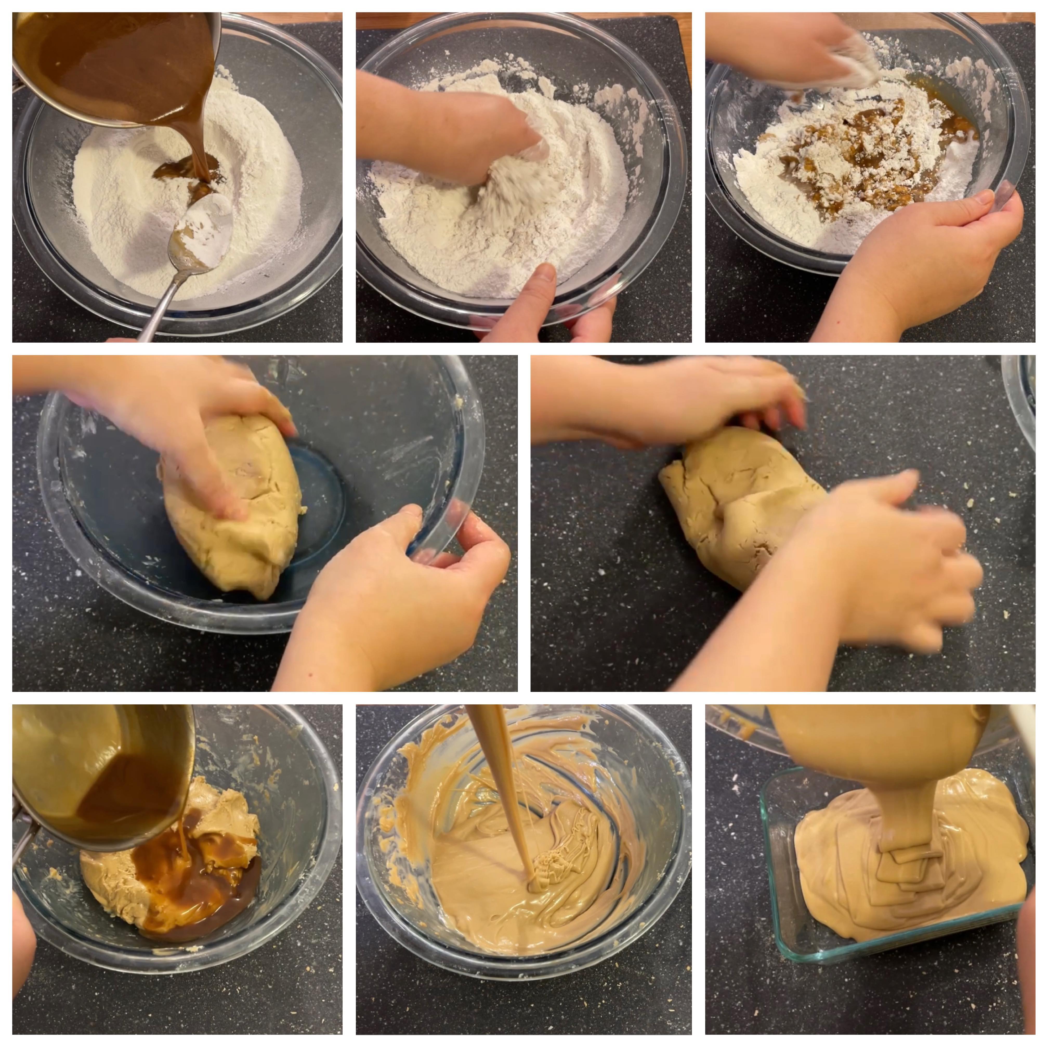 (3)將糯米粉和粘米粉過篩,倒進玻璃碗內,逐少加入糖水,搓成麵團(再搓大約15-20分鐘),然後再將剩下的糖水慢慢加入,不斷與麵團拌勻,麵團會變回粉漿狀,如粉漿太稠可以加20克水,最後加入油,拌勻。