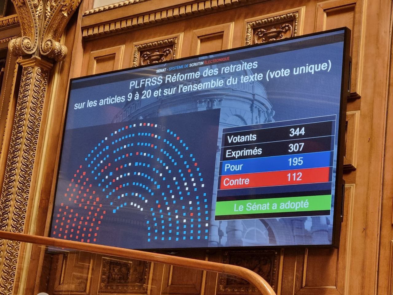 參議院周六加速辯論審查,並於晚上表決總統馬克龍的年金改革法案,最終以195票贊成、112票反對,通過法案,意味政府離法案正式通過邁進一大步。