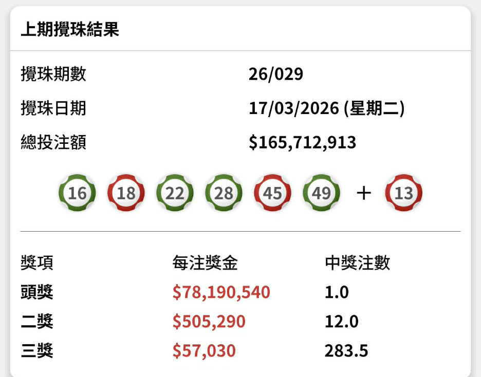 估計頭獎基金達$80,000,000的六合彩「幸運二金多寶」今晚攪珠,結果頭獎一注獨中。