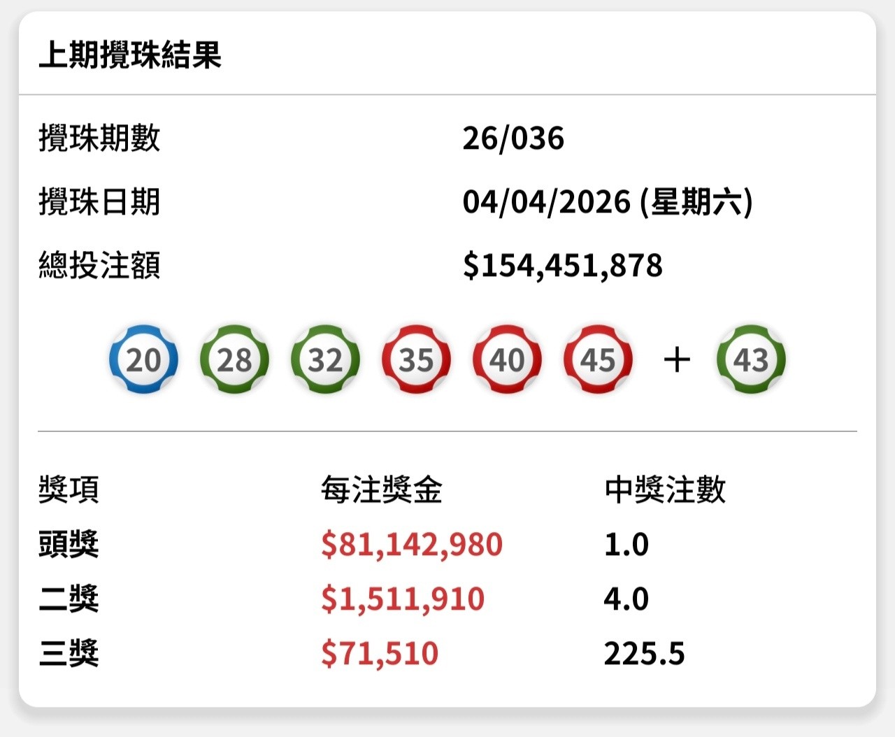 首頁港聞港聞 復活節金多寶頭獎一注中 作者:熱血編輯部 (陳五) 04-04-2026 Like Facebook Twitter 更多 Like 分享0 留言0 今晚攪珠的六合彩復活節金多寶,結果頭獎有一注中,十元一注派$81,142,980。