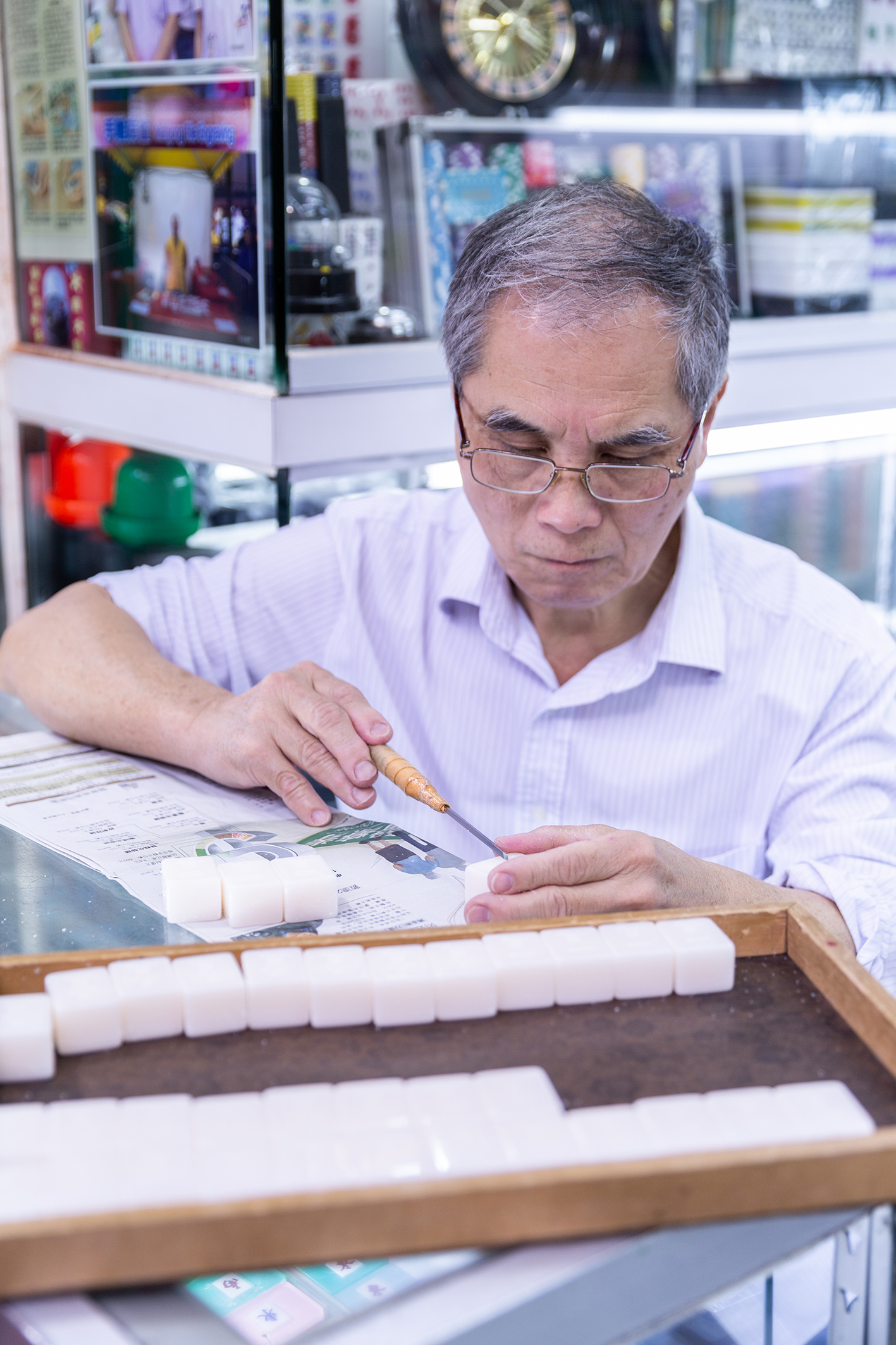 「麻雀材料靚唔靚,只要一睇一聞一雕就知。廉價的麻雀,你一打開個盒,化學臭味撲鼻而來。我日日夜夜對住佢哋,長期下來,會影響健康!至於雕刻,廉價者可謂『朽木不可雕』,如豆腐渣般,極難掌握。因此,我的店只賣靚貨。」