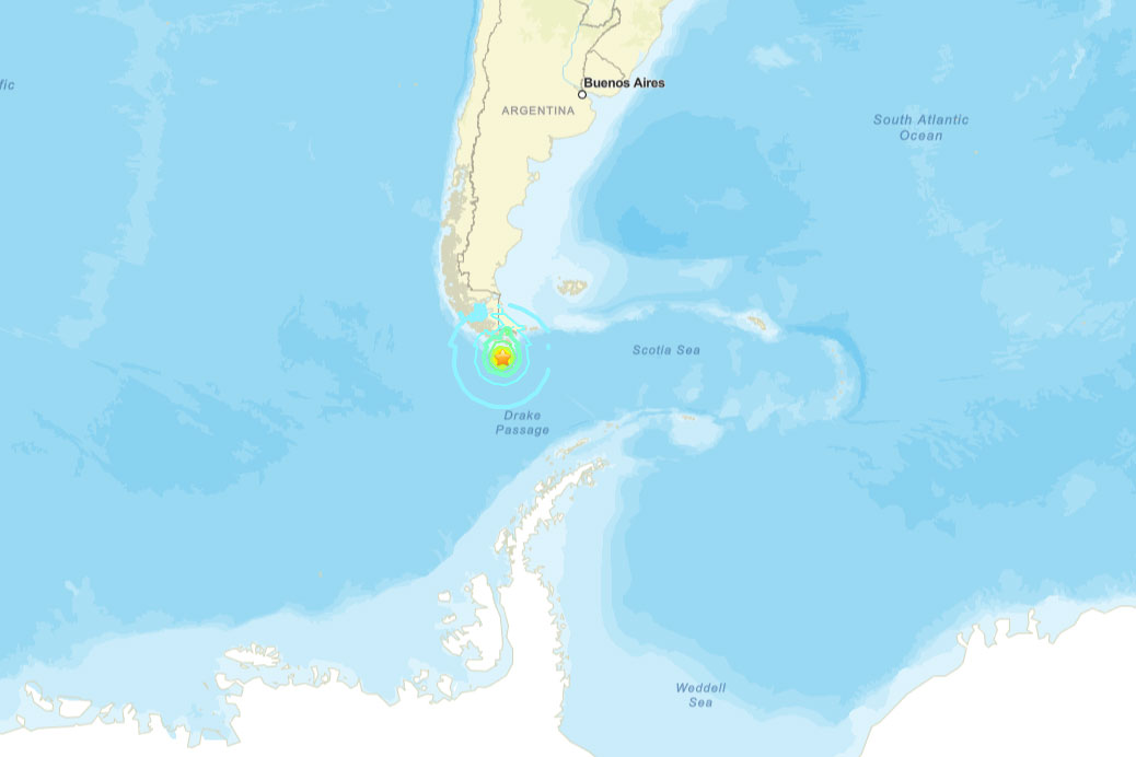 美國地質勘探局表示,震央位於德雷克海峽,即南緯56.782度,西經68.209°附近,震源深度僅10公里。