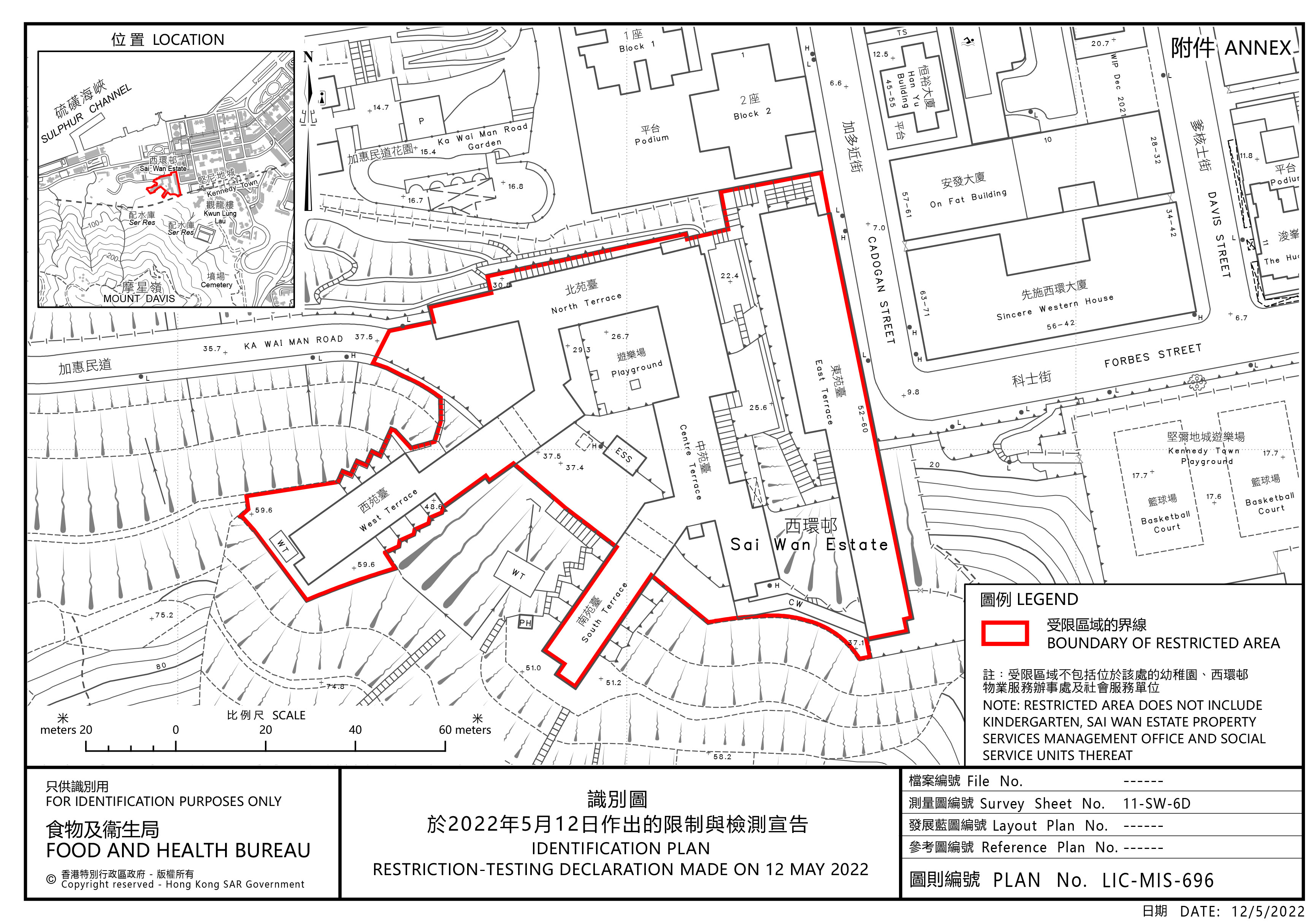 政府今日(5月12日)引用《預防及控制疾病(對若干人士強制檢測)規例》(第599J 章),作出限制與檢測宣告,自下午3時30分起限制在中西區指明「受限區域」,即中西區西環邨內的人士,須留在其處所並接受強制檢測。受檢人士須在其處所等候,直至「受限區域」內所有已識別的受檢人士完成檢測,而相關檢測結果亦已獲大致確定,方可離開其處所。政府目標是在明日(5月13日)上午約10時完成此行動。視乎檢測結果,行動或會延長。