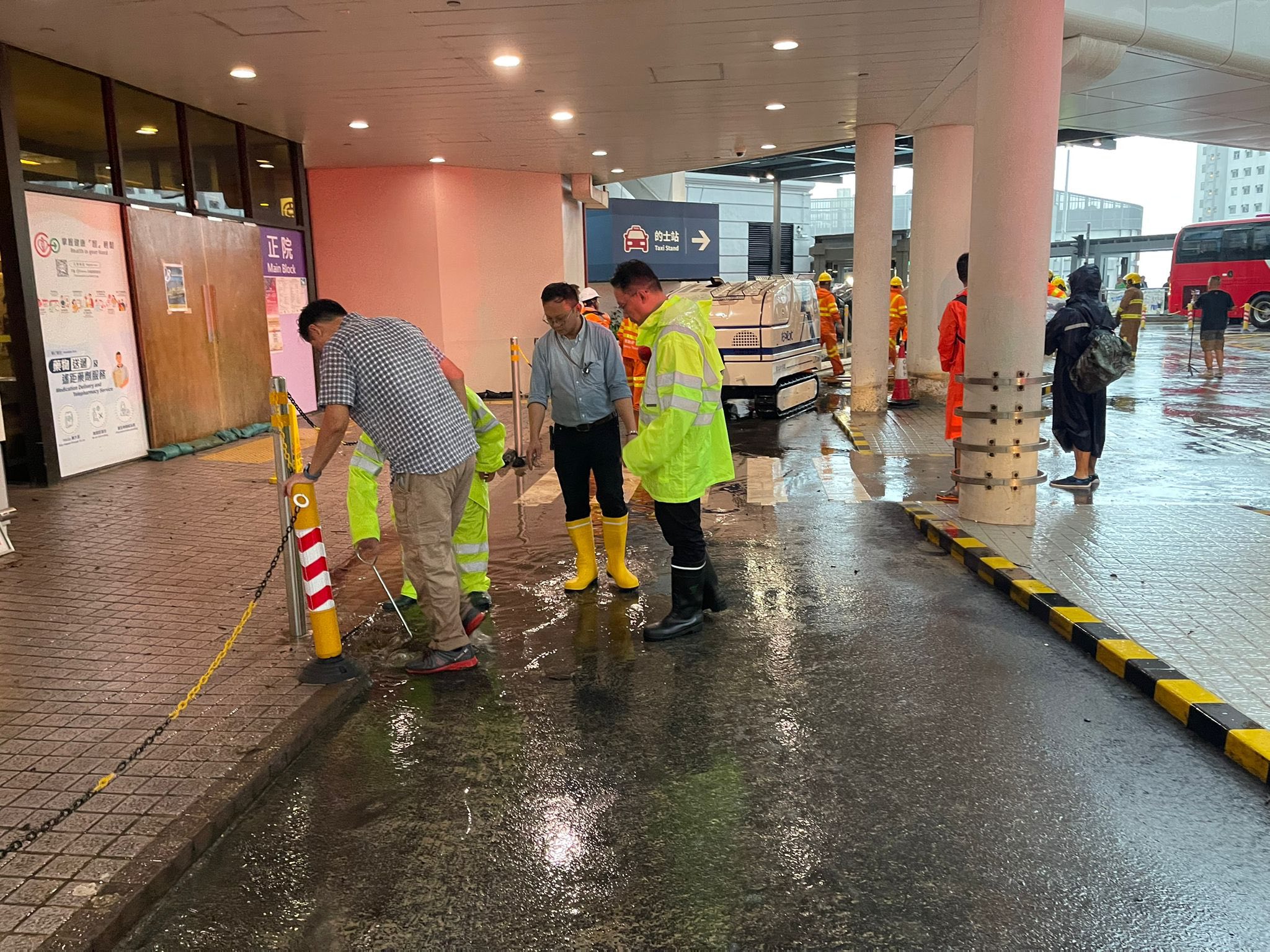 前往瑪麗醫院的馬路嚴重水浸,大量雨水由山坡湧至路上。大批渠務署及消防人員協助處理醫院範圍內積水,有渠蓋被打開,醫院部分入口堆放了沙包。