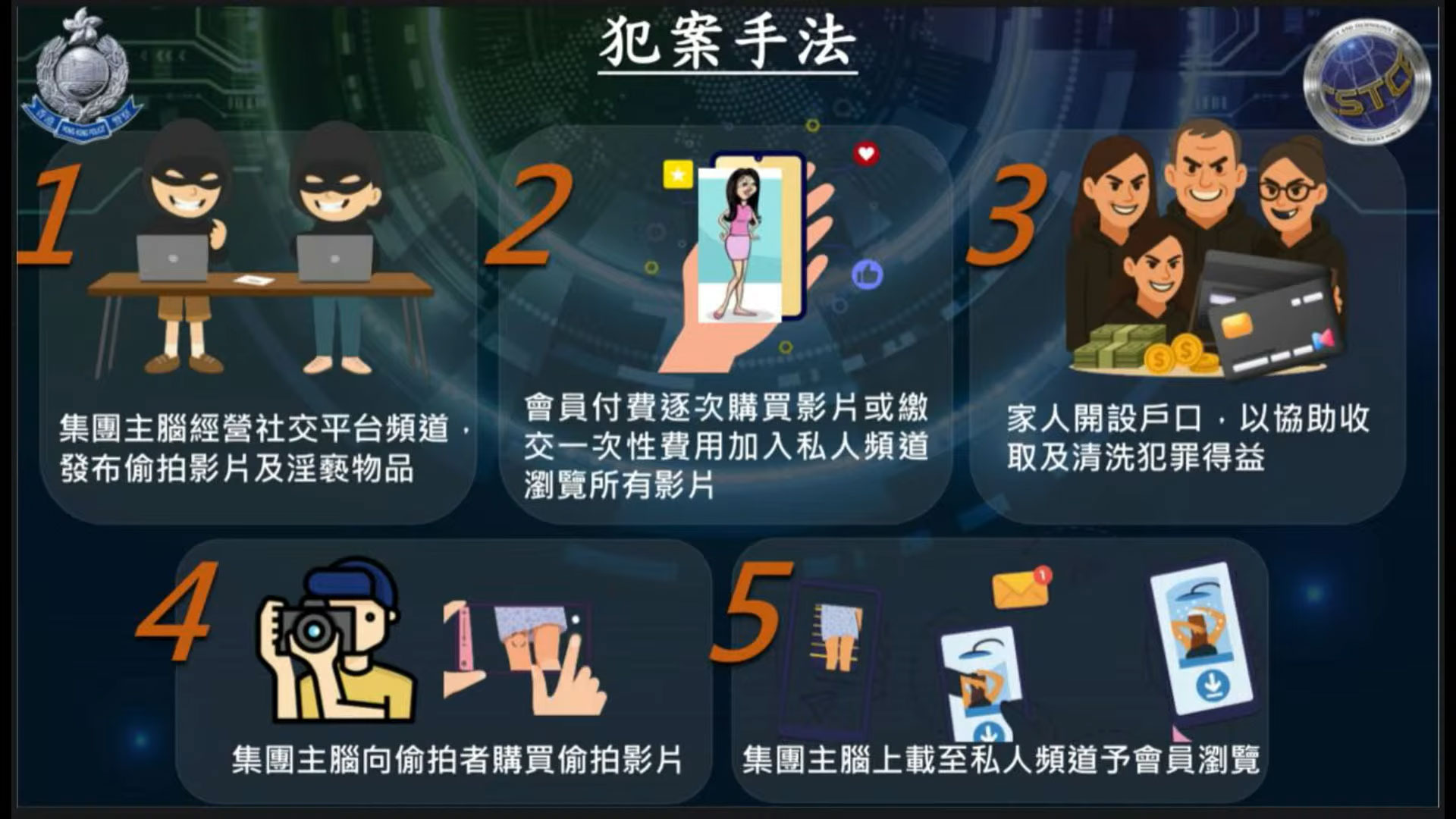 警方以「串謀在未經同意下發布私密影像」、「串謀發布淫褻物品」以及「洗黑錢」等罪,拘捕6男4女,年齡介乎20至62歲,當中包括兩名犯罪集團主腦及4名骨幹成員。