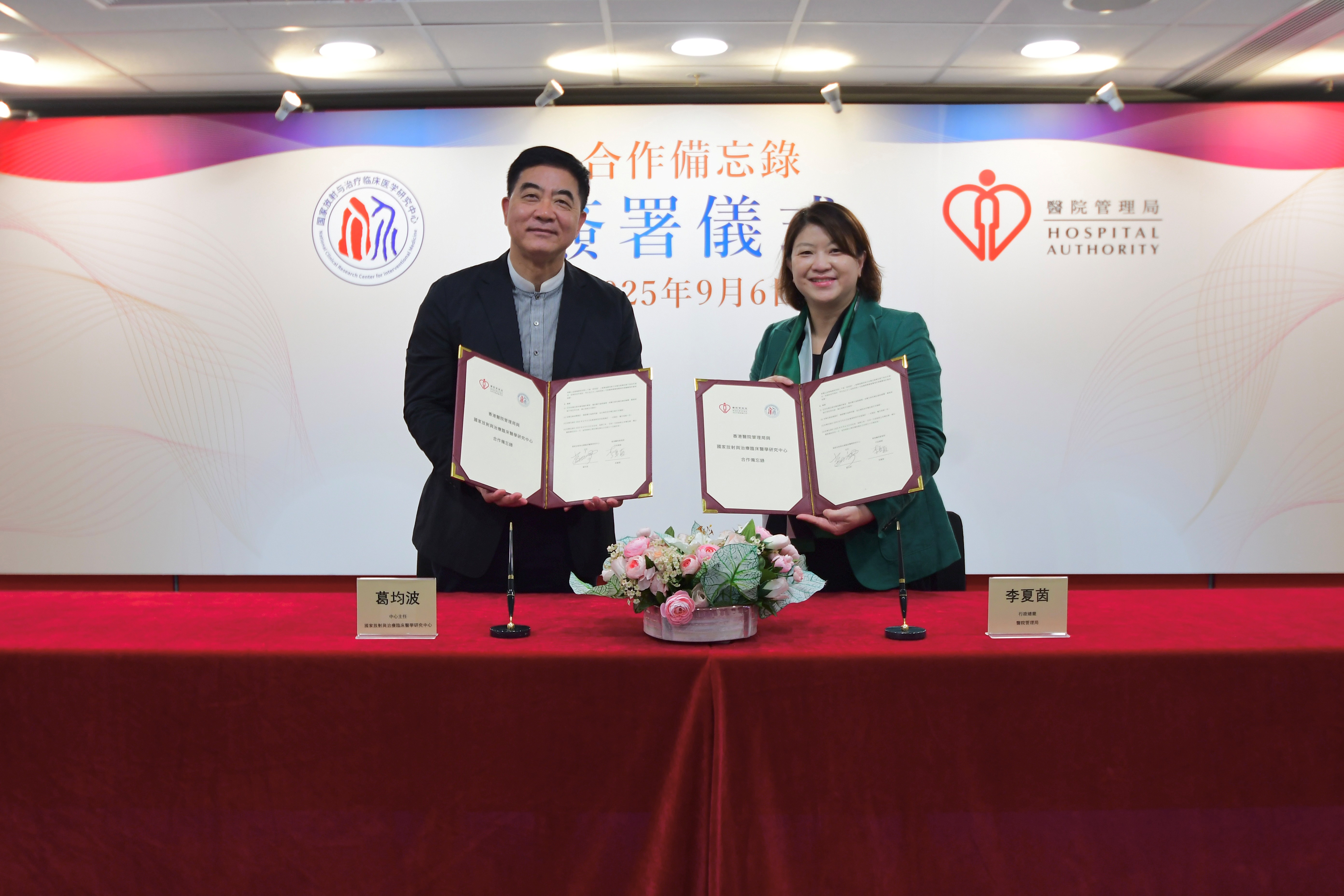 醫管局今日(9月6日)與國家放射與治療臨床醫學研究中心簽署為期三年的合作備忘錄,就胸痛中心與心血管疾病專病中心的建設、人才交流與培訓,以及公眾教育等多方面加強合作,攜手推進心血管疾病防治的規範化建設與協同發展,共同提升區域醫療水平。