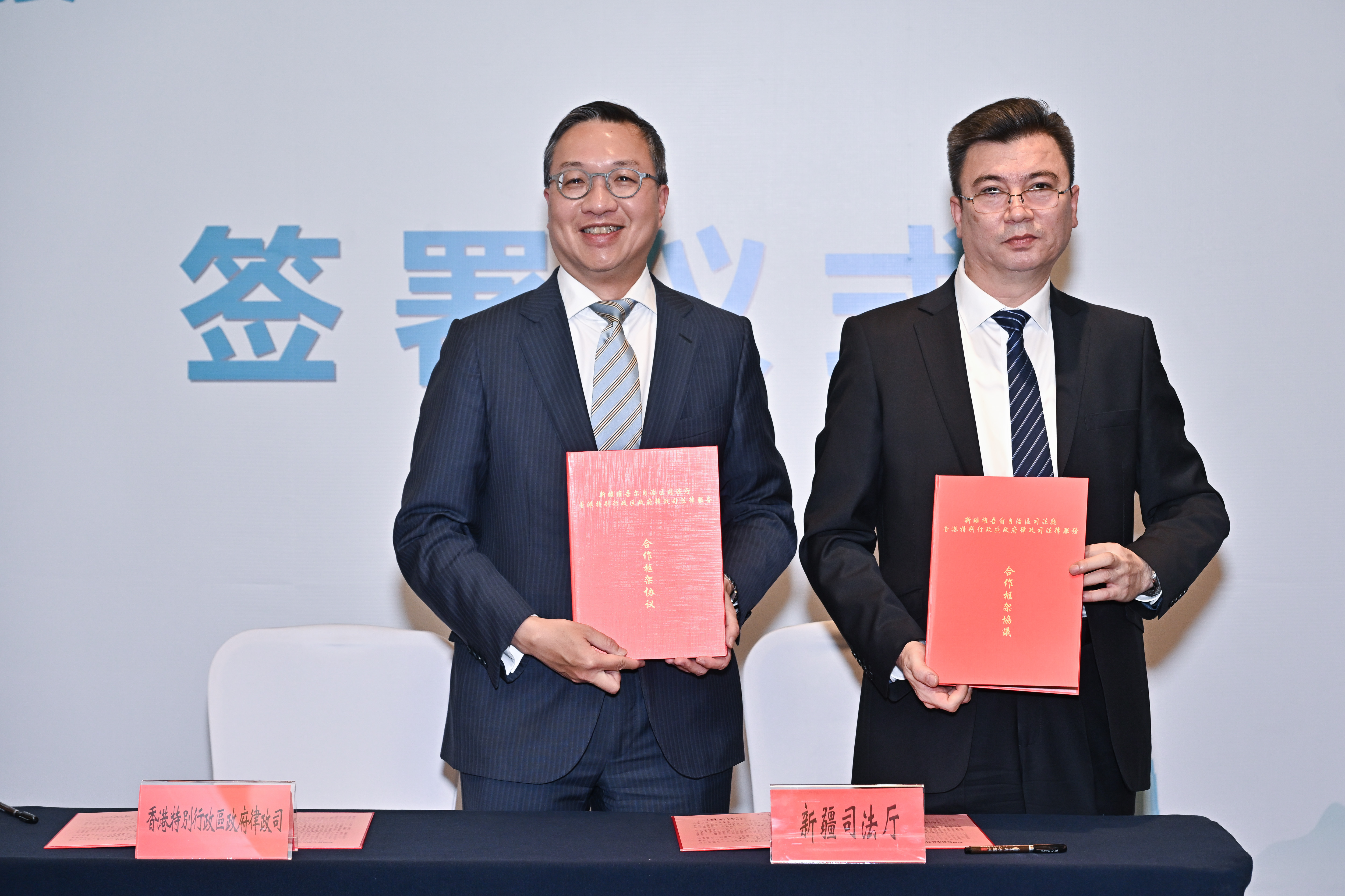 研討會期間,律政司與新疆維吾爾自治區司法廳簽訂法律服務合作框架協議。根據協議,兩地法律部門支持新港法律業界加強交流及業務合作;而香港大律師公會亦與新疆律師協會簽訂合作備忘錄,加強新疆律師與香港大律師的合作,促進新港兩地法律專業進一步交流和專業協作。