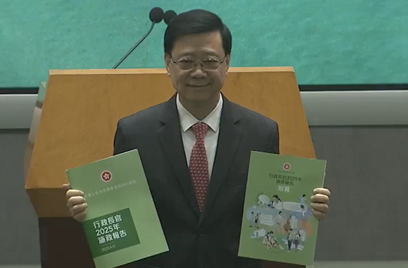 行政長官李家超明天(9月17日)會發表任內第4份施政報告,他今早(9月16日)出席行政會議前,展示新一份施政報告,沿用綠色做封面,主軸圍繞經濟和民生。