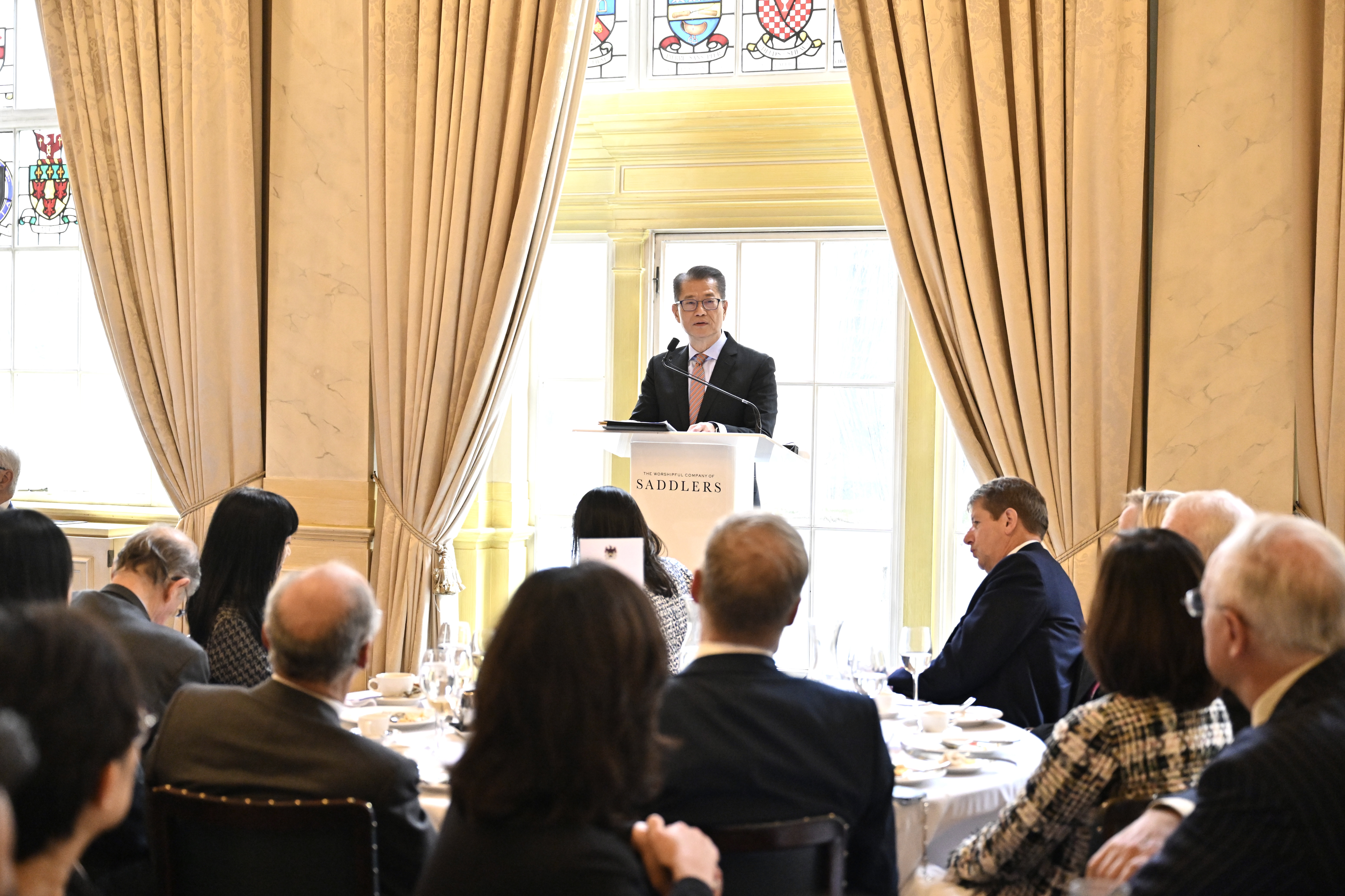 其後,他出席了英國香港工商協會的午餐會,向超過120名英國政商界嘉賓發表演說。陳茂波表示,國家堅定支持「一國兩制」制度在香港長期實施。在這個制度下,香港獨特的地位和普通法、法治,以及其他優勢長期持續。展望未來,香港正全速推進以金融服務和創新科技雙引擎引領的高質量發展,並決意成為國際綠色科技和綠色金融中心。