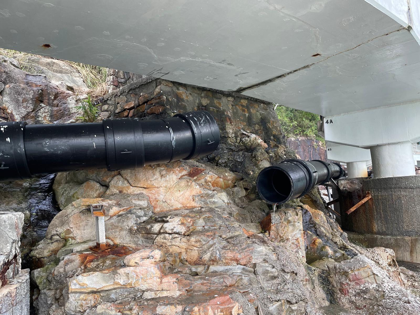 署方已即時停用有關污水管,並將污水引流至淺水灣總污水泵房旁的現有緊急應變污水處理設施,經過化學強化沉澱及消毒處理程序後,才排放出大海。署方現正為受損污水管進行緊急修復工程,預計於本周日完成,屆時經修復的污水管亦會重新投入使用。