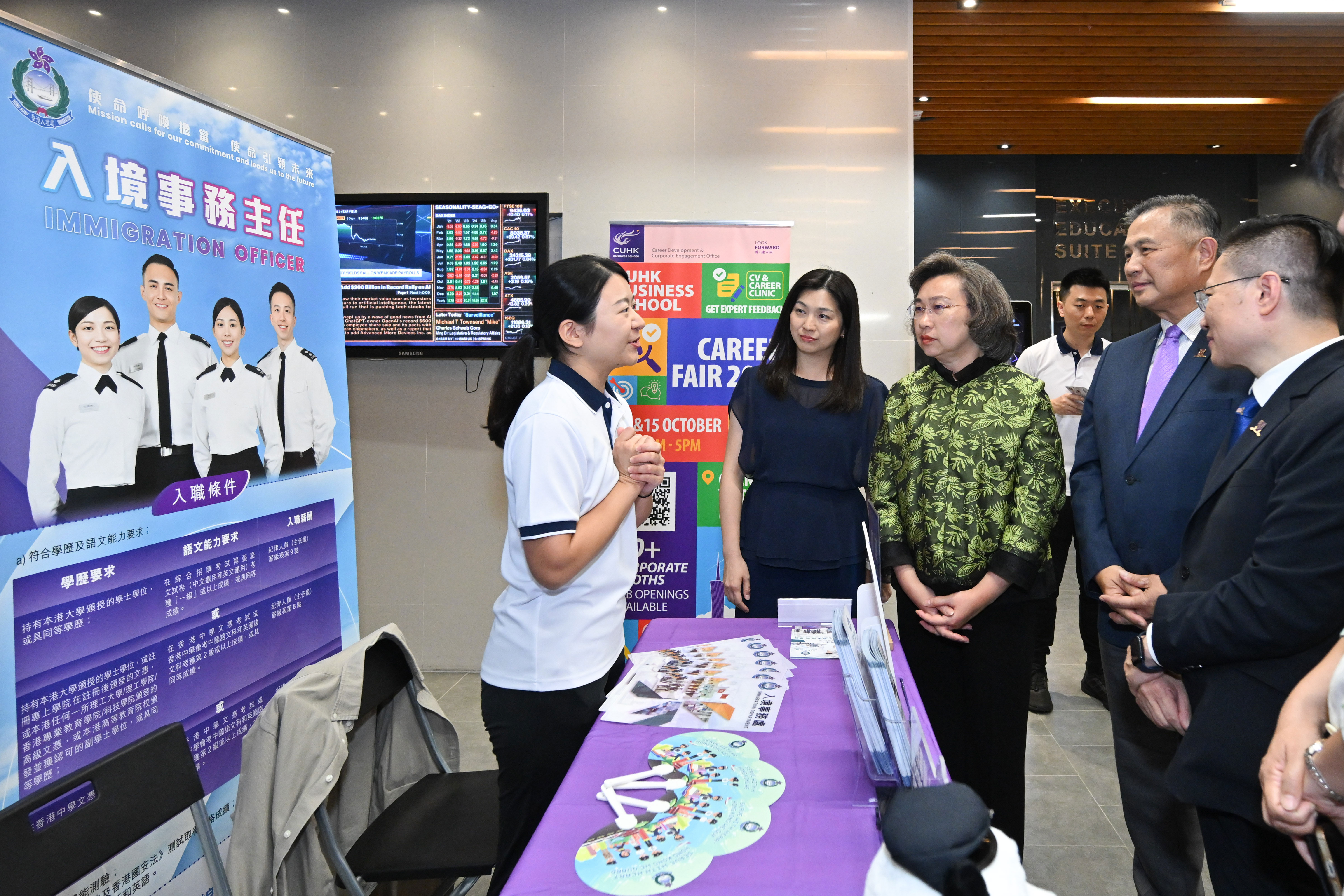 公務員事務局局長楊何蓓茵今日(10月2日)下午與香港中文大學副校長(教育)金國慶教授,一同參觀在中大校園舉行的政府職位招聘展覽,鼓勵大學生按自己的志趣多了解政府不同部門的工作,以及政府為年輕人提供的就業機會,及早做好生涯規劃。