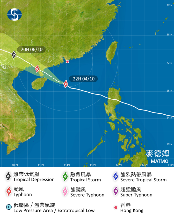 在晚上10時,颱風「麥德姆」集結在香港以南約360公里,即在北緯19.1度,東經113.9度附近,預料向西北偏西移動,時速約25公里,橫過南海北部。