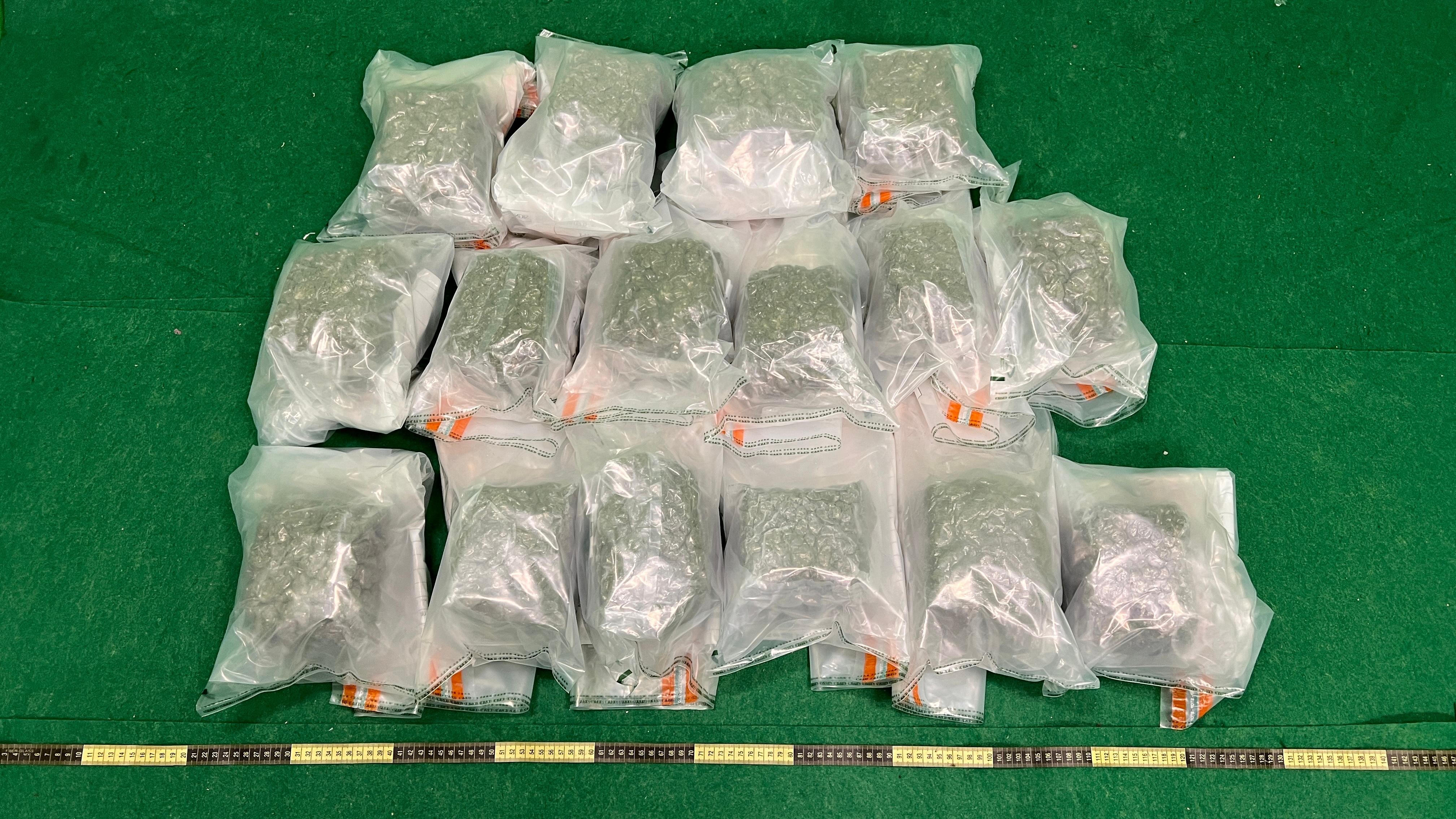 第一案件涉及一名昨日從泰國曼谷飛抵本港的24歲男子。海關人員替他清關時,在其寄艙行李內16個真空包裝膠袋中發現重約8公斤的懷疑大麻花,估計市值約160萬元,該名男子隨即被捕。