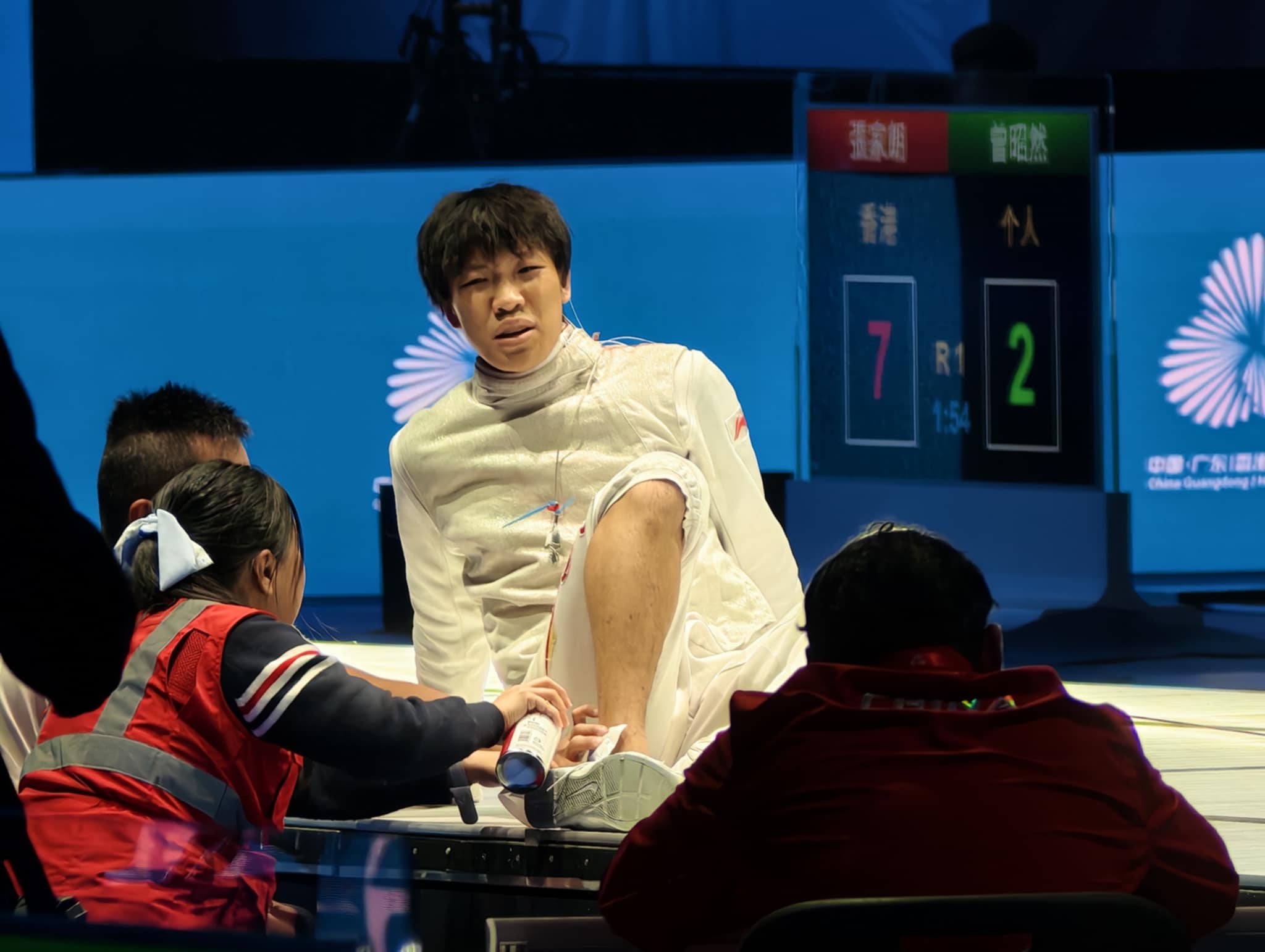 在銅牌戰張家朗面對以個人身份出戰的曾昭然,曾昭然於比賽期間一度要接受治理,最終張家朗以15:2取勝,獲得銅牌。