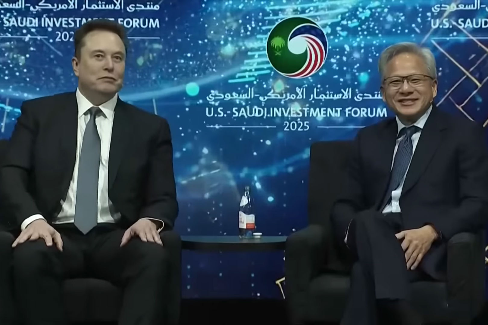 馬斯克在華府舉行的「美國-沙特阿拉伯投資論壇」宣布該企劃,身旁是人工智能晶片大廠Nvidia行政總裁黃仁勳。