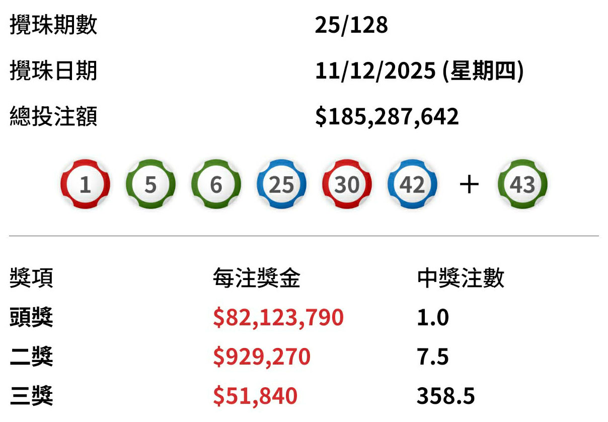 結果今期六合彩頭獎一注中,派$82,123,790。