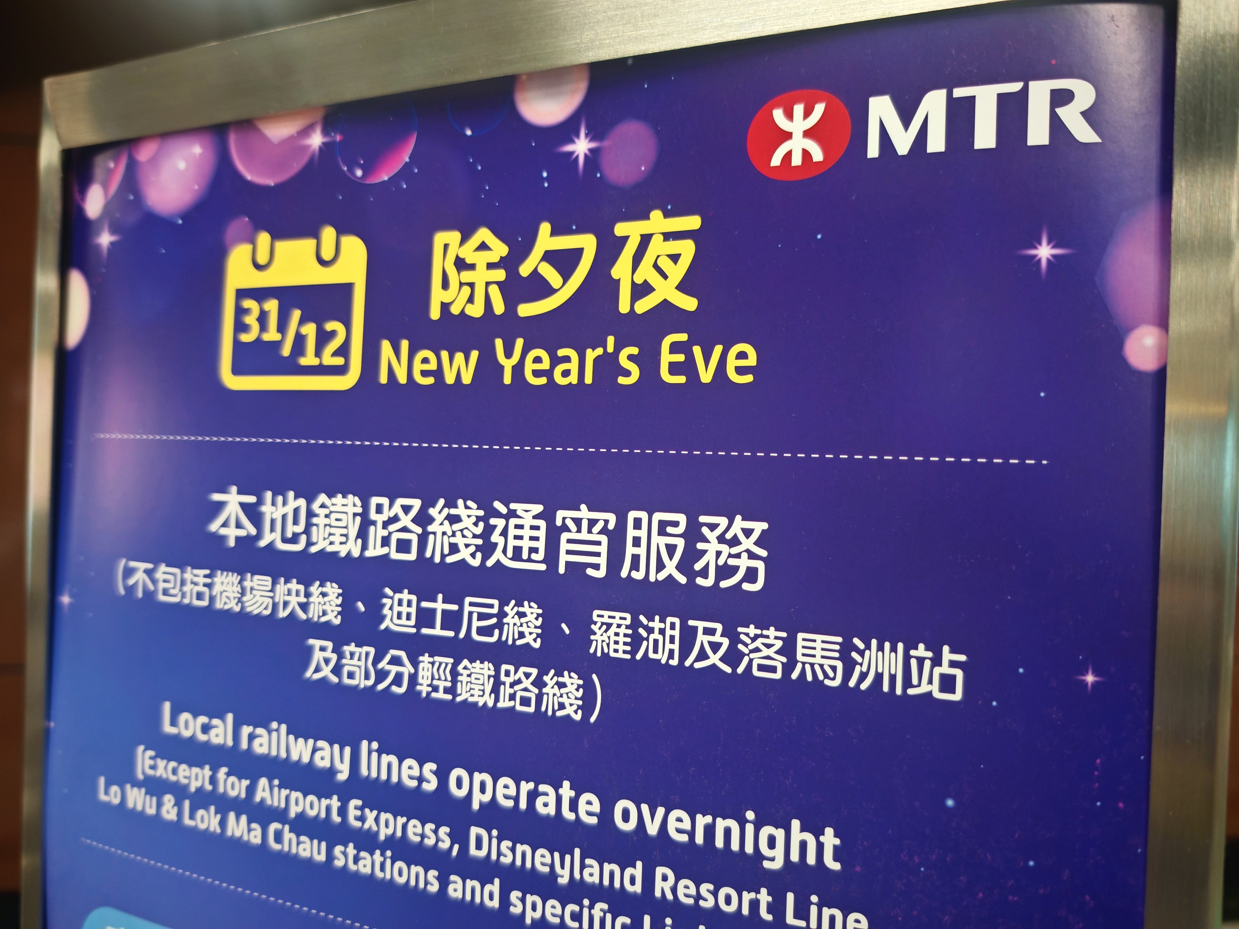 今日(12月31日)為大除夕,港鐵會加強服務,本地鐵路綫通宵行駛,機場快綫、迪士尼綫、羅湖及落馬洲站及部分輕鐵路綫除外。