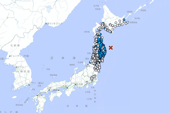 地震發生於晚上11時27分,震央位於北緯40.1度 東經142.9度附近,震源深度30公里。