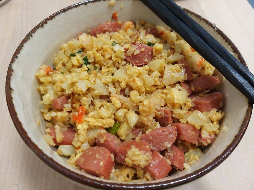 材料:椰菜花、洋蔥、雞蛋、香腸、甘筍、蔥粒