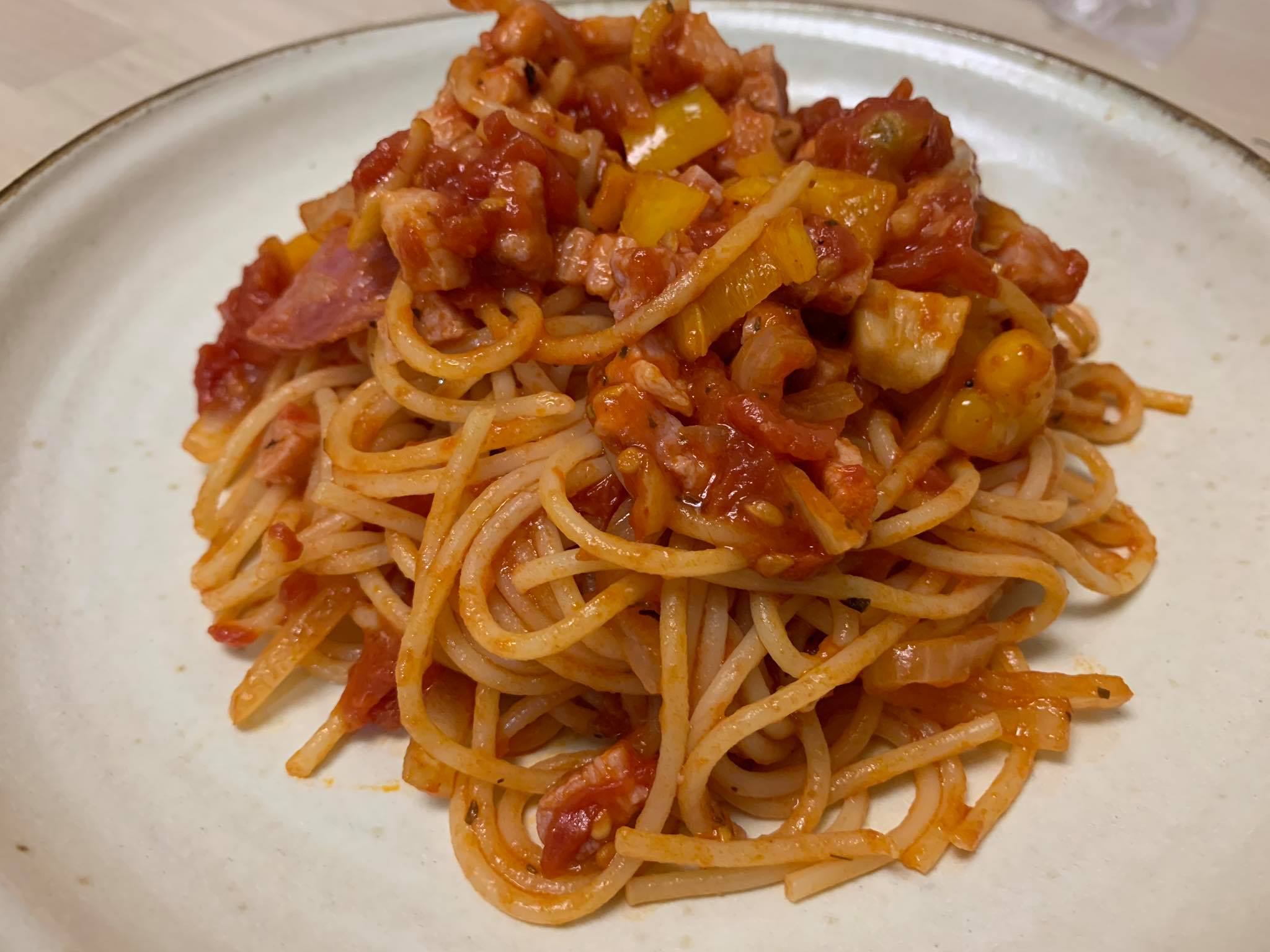 材料:意粉、罐頭去皮番茄、莎樂美腸片、煙肉粒、洋蔥絲、蒜片
