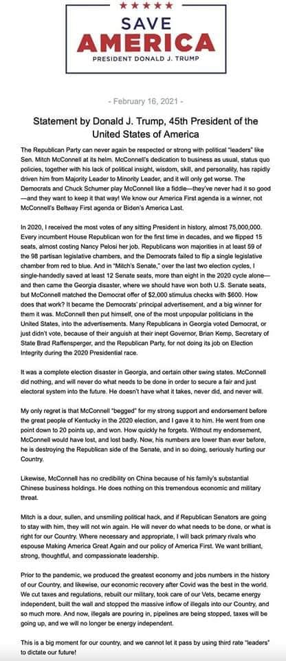 參議院共和黨領袖的麥康奈爾,上周在參議院對特朗普的彈劾聆訊中,投票反對彈劾,其後批評特朗普在國會被衝擊事件中,負有道德上的責任。