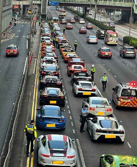 今日(2月21日)早上約7時,舊灣仔警署對開的告士打道有45輛跑車被截查,猶如名車展一樣。