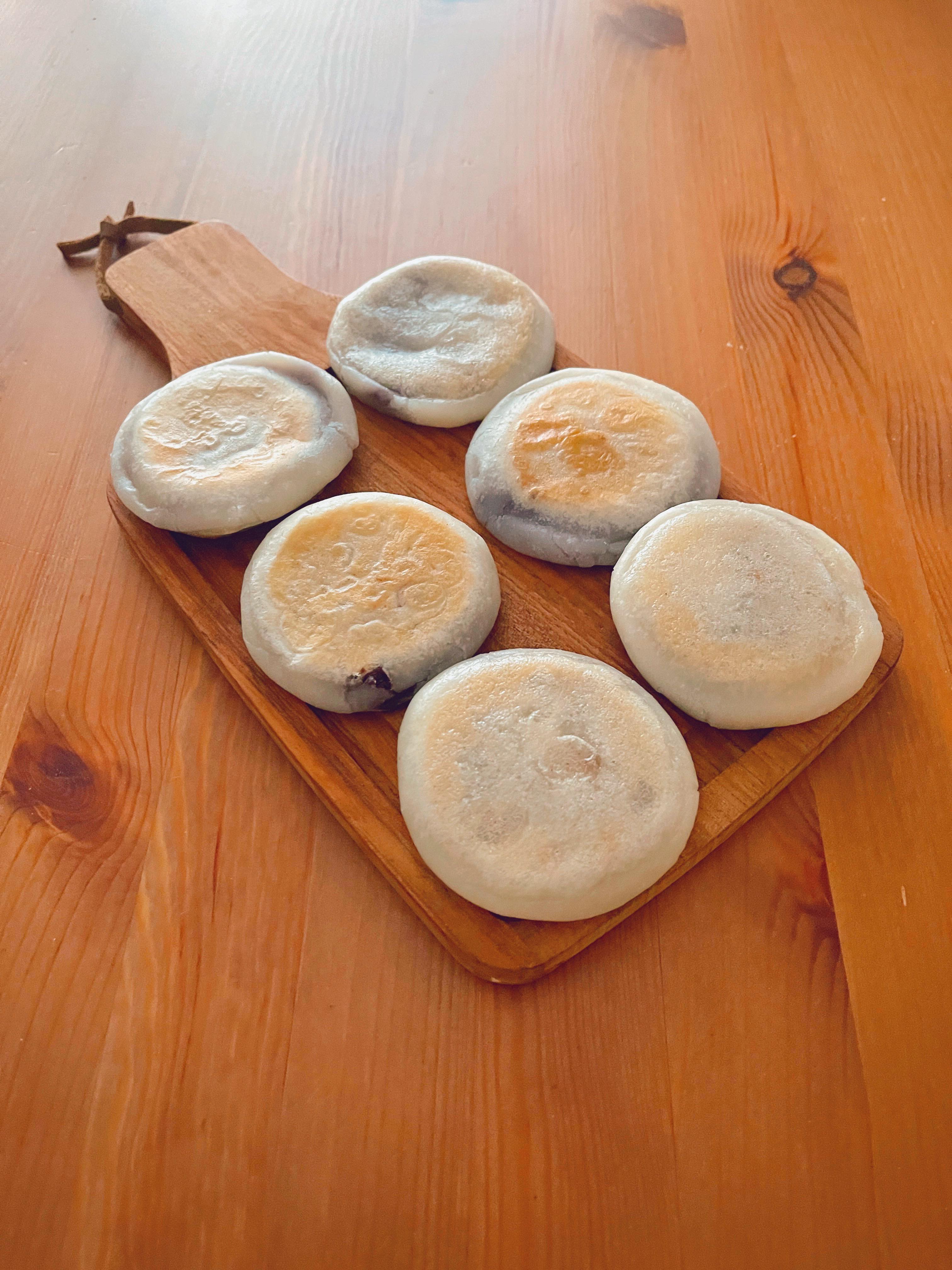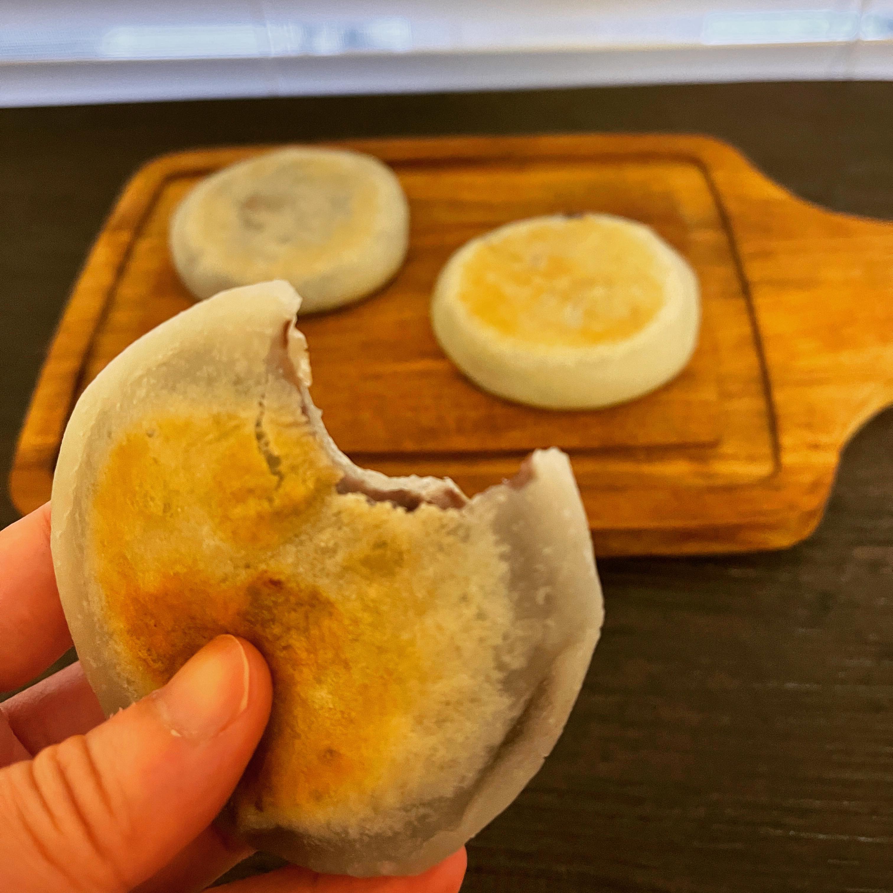 (4)用平底易潔鑊,抺少許油,將豆沙燒餅放入,加蓋煎第一面至用手感覺玻璃蓋盪熱,即可反轉煎第二面,全程以小火煎至兩面黃金至熟即可。稍稍放涼仍是暖暖的即可食用。