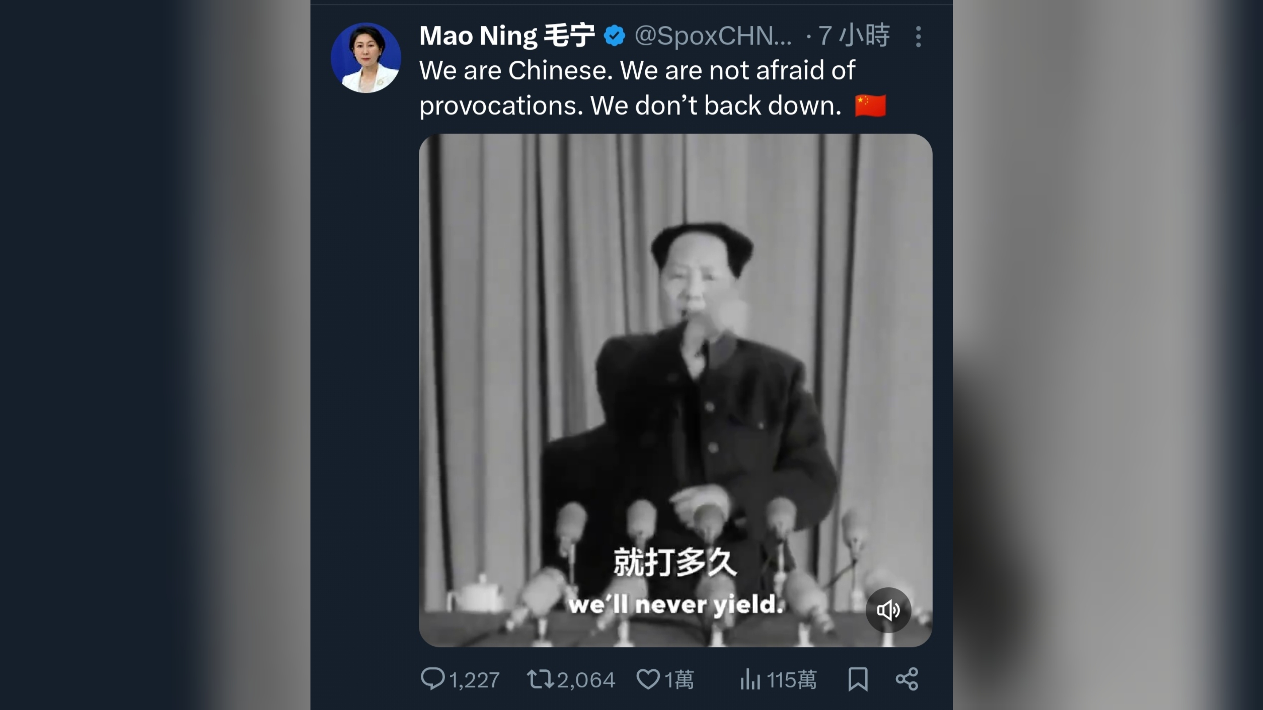 毛寧配文強調,中國人不怕挑釁,不會退縮。