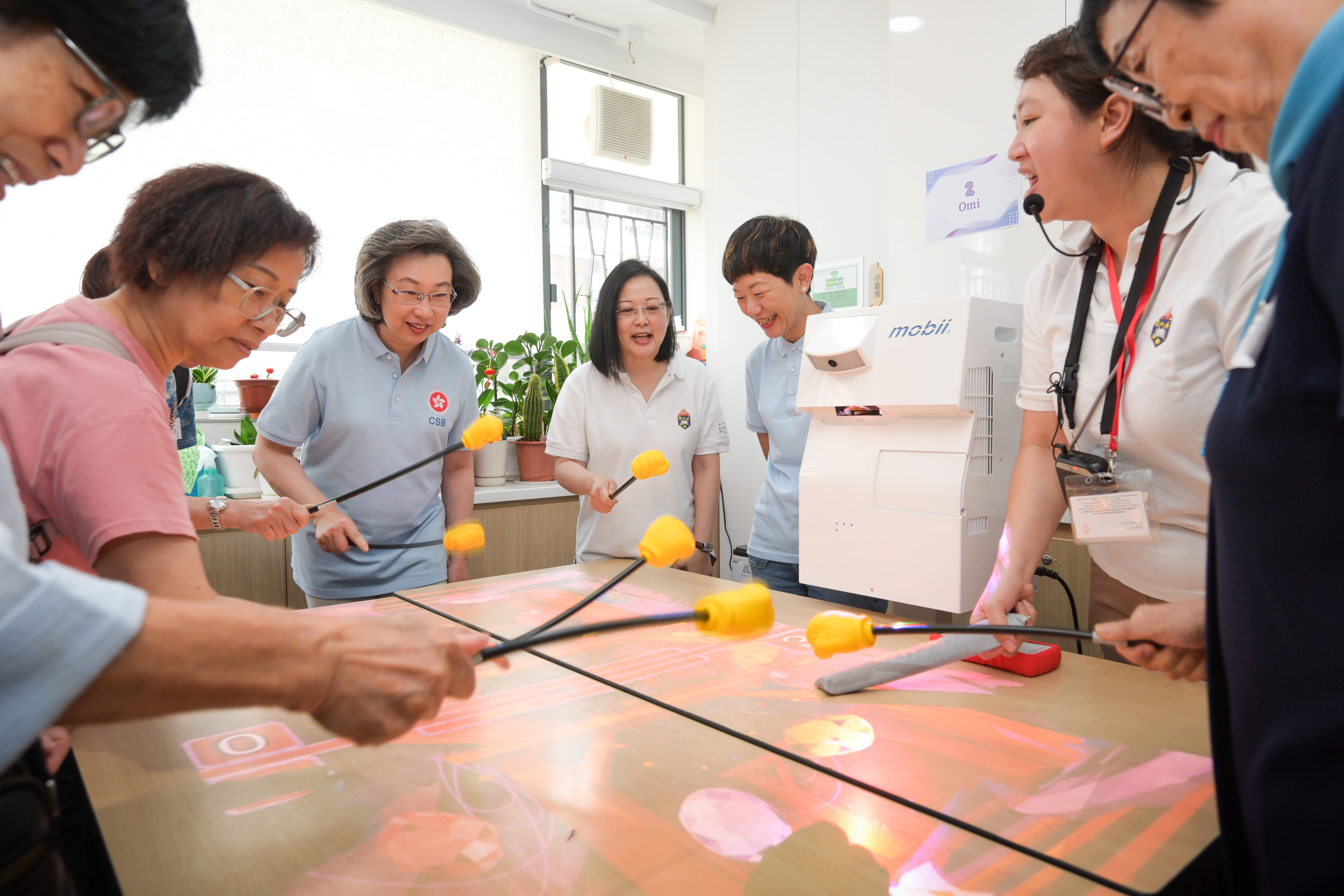 公務員事務局局長楊何蓓茵、公務員事務局常任秘書長梁卓文及數字政策專員黃志光一起加入公務員義工行列,在香港聖公會樂民郭鳳軒綜合服務中心參與「友智識」長者數碼共融計劃義工活動。「老友記」在義工們的協助下,學習透過「智方便」流動應用程式,了解一些實用資訊,例如天氣狀況、「防騙視伏器」的應用、急症室輪候時間等。