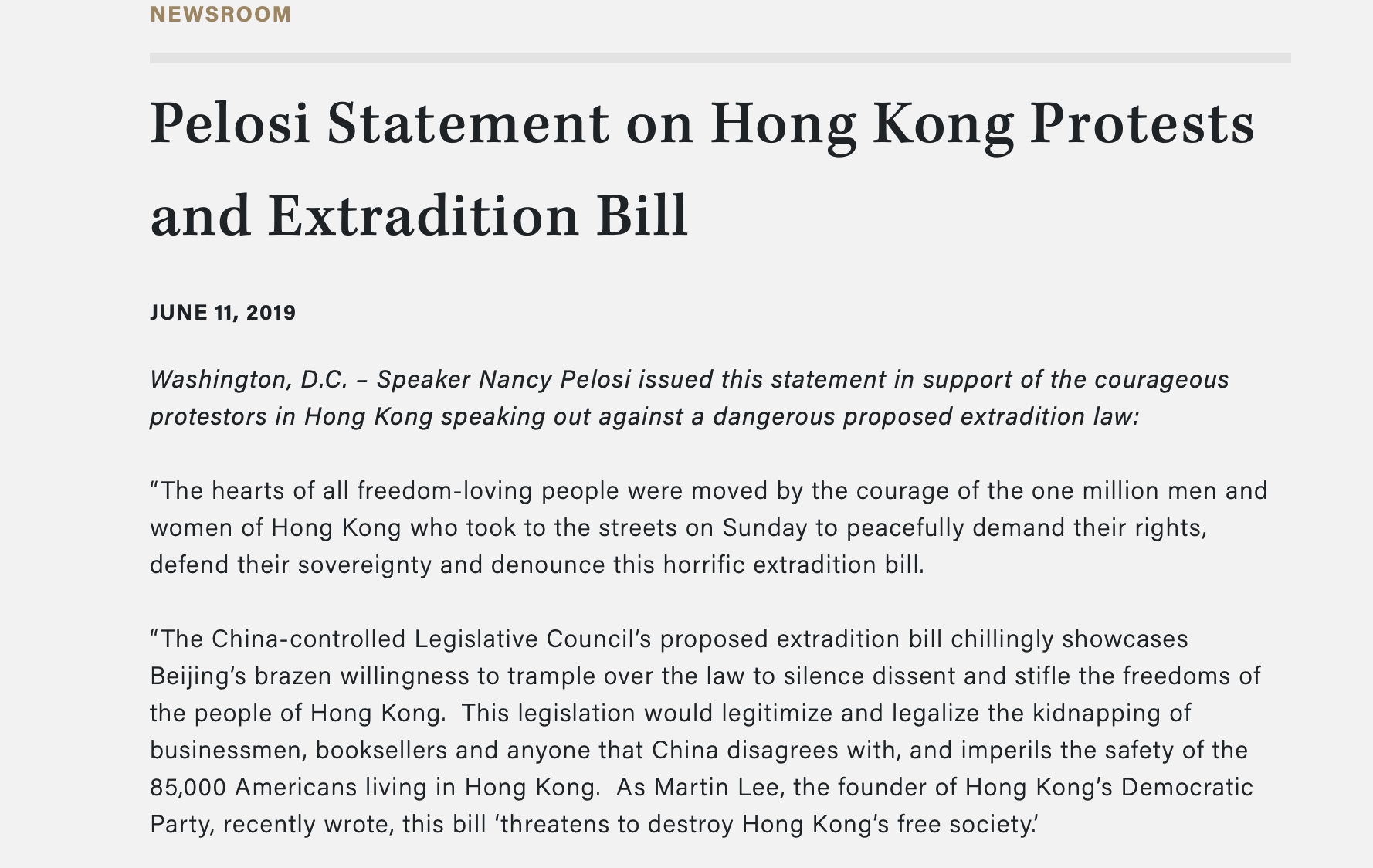 佩洛西指,自己被日前參與反修例遊行的100萬香港市民感動,形容示威者和平地爭取權益和捍衛主權。佩洛西又批判《逃犯條例》修訂為可怕的草案,扼殺港人的自由,讓綁架商人、書商和其他人的行為合法化,危及在香港生活的85,000名美國人之安全。