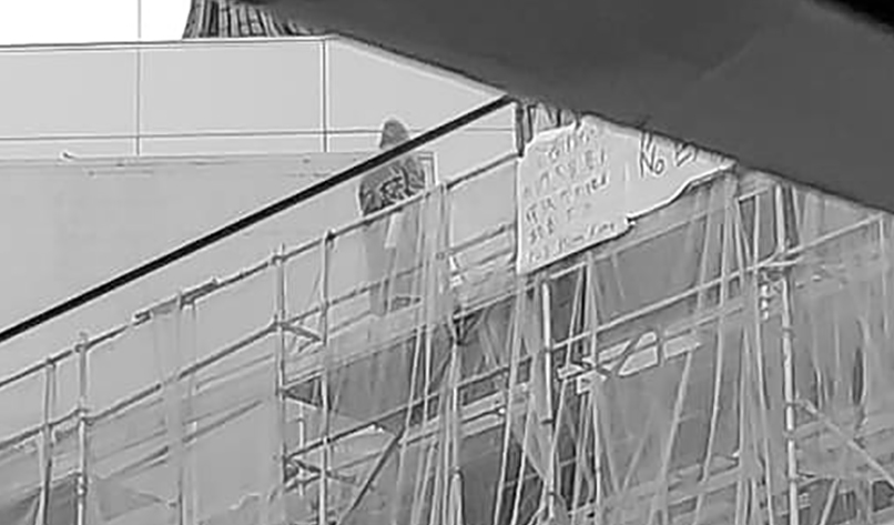 該名身穿黃色雨褸的男子,展示了一幅白底黑字的「反送中No Extradition To China」橫額,上面寫上「全面撤回送中,我們不是暴動,釋放學生傷者,林鄭下台,Help Hong Kong」。
