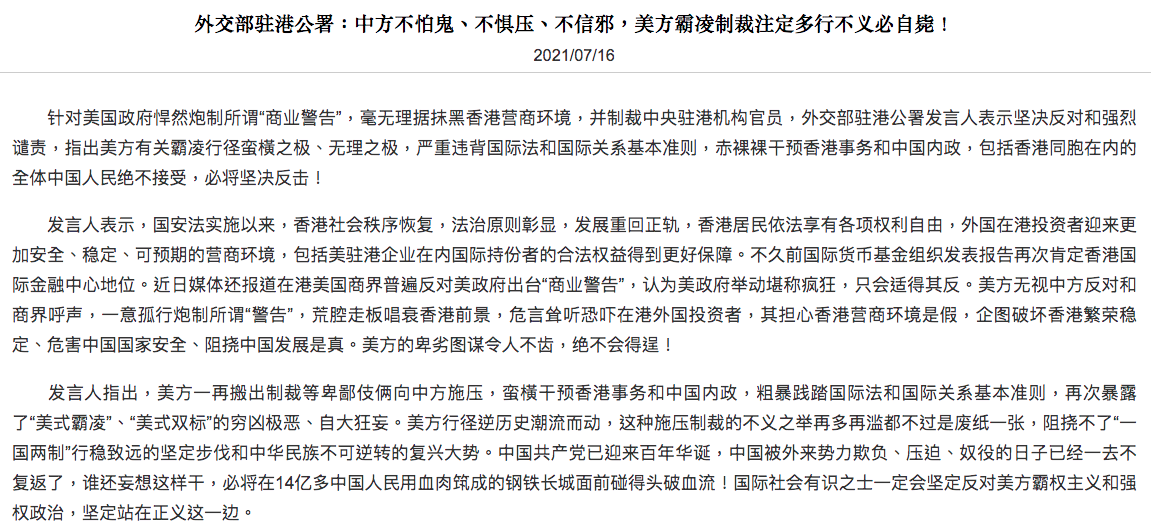 發言人批評美方毫無理據抹黑香港營商環境,有關霸淩行徑蠻橫之極、無理之極,嚴重違背國際法和國際關係基本準則,赤裸裸干預香港事務和中國內政。