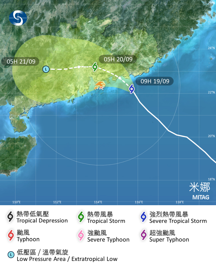 按照現時預測,「米娜」會在今日黃昏前後登陸廣東東部沿岸,同時亦受東北季候風影響而轉向偏西方向移動,移近珠江口一帶但逐漸減弱,在本港以北100公里左右掠過。天文台會視乎「米娜」屆時的減弱程度、其烈風區與本港的距離及本地風力變化,評估是否需要在今晚改發更高熱帶氣旋警告信號。