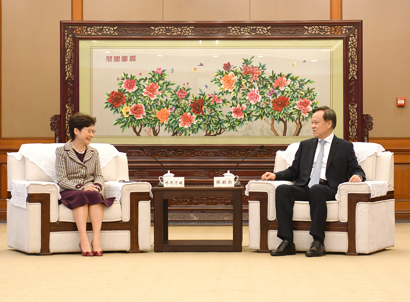 林鄭月娥在政制及內地事務局局長曾國衞陪同下,與重慶市委書記陳敏爾和市長唐良智會面,並出席對方所設的晚宴。林鄭月娥表示,2018年9月與唐良智率領的訪港代表團會面時,雙方都同意加強兩地在港口物流、創新科技和專業服務等方面的合作,而她也表示希望早日訪渝。她很高興今天能到訪重慶,期望會面能深化兩地之間的交流和合作。