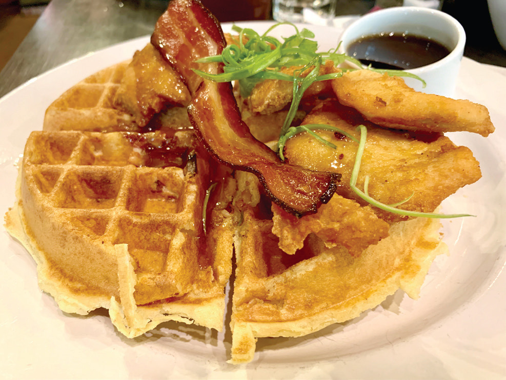 餐牌上寫著waff les with chicken tenders and extra bacon,上菜時只見一條煙肉,哪來extra 呢?切開waff les才發現原來裡面充滿著煙肉!配上店家特製的spicy syrup(其實不太吃得出spicy),既鹹且甜,很有驚喜!消防局餐廳