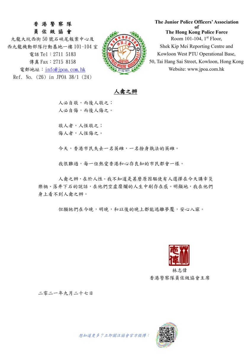 女高級督察林婉儀於執行反走私任務期間墮海殉職,香港警察隊員佐級協會主席林志偉發聲明,感到非常難過及痛心,並希望處長蕭澤頤轉達協會最深切的慰問,並協助他們早日走出傷痛。