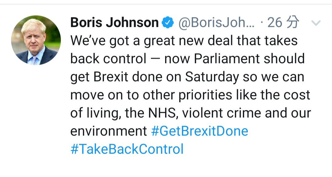 首頁港聞兩岸國際 英國與歐盟達成脫歐協議 作者:熱血編輯部 (陳五) 10-17-2019 Like Facebook Twitter 更多 Like3365 分享0 留言0 英國首相約翰遜於twitter宣布,與歐盟達成脫歐協議。 約翰遜形容,英國取得一份可取回控制權的重大協議。