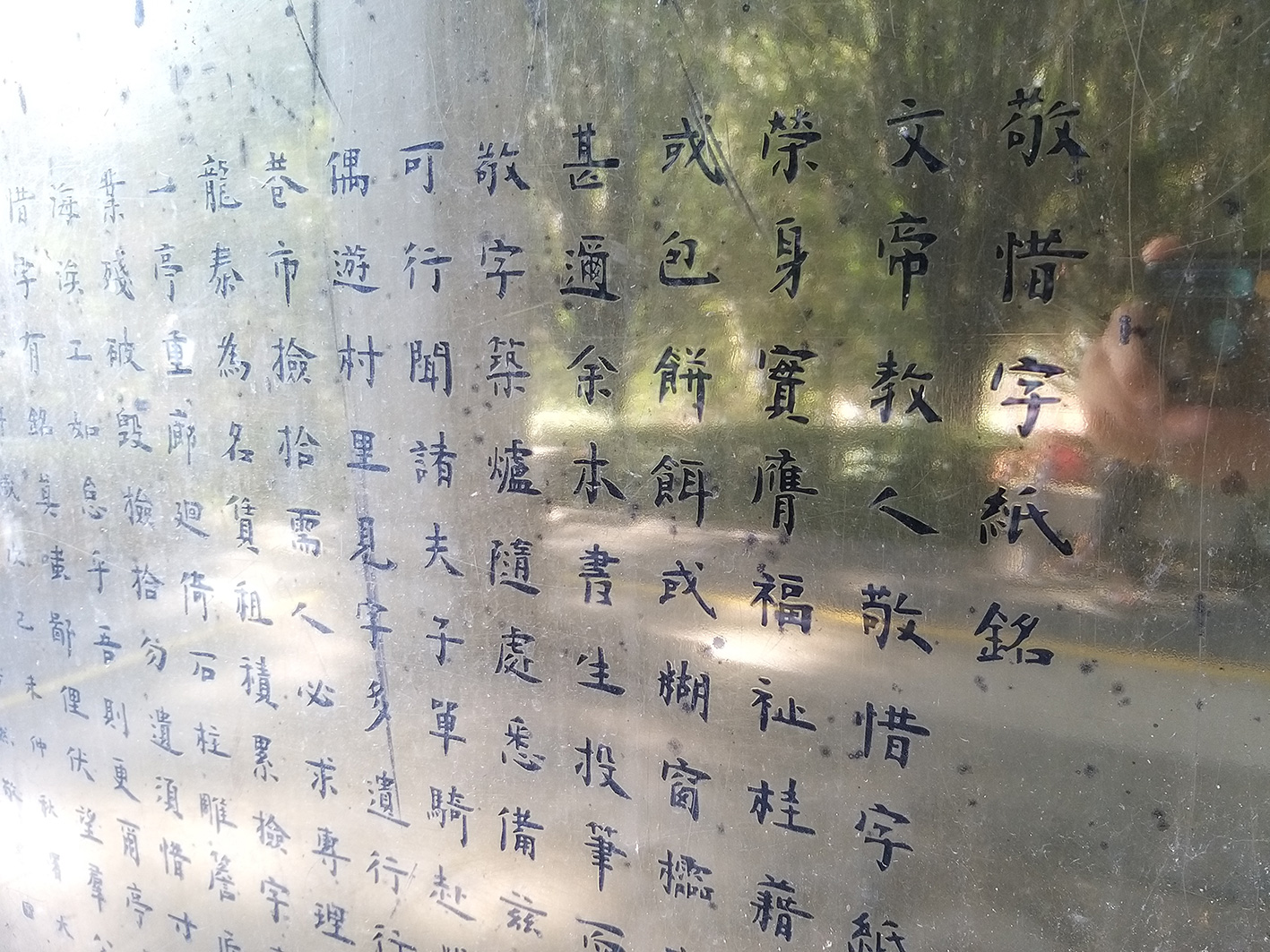 九龍寨城公園最吸引目光的,莫過於被列為法定古蹟的前九龍寨城衙門和南門遺跡。而就在這兩個遺跡不遠處的一座小土丘上,便是敬惜字紙亭的所在地。這座於公園修建時,即1990年代才興建的捲棚方亭,並不算什麼歷史建築,貌似和其他園內現代建成的亭台樓閣般,只是為了重塑一派清代江南庭院景致而建。只不過,當登上土丘走進亭裡,便會發現亭內不祇懸掛著刻有「敬惜字紙亭」的橫匾,地上還豎立著一塊石碑,碑上銅片刻有一篇名為《敬惜字紙銘》的銘文。(1)究竟內容是什麼?又是誰撰寫的呢?