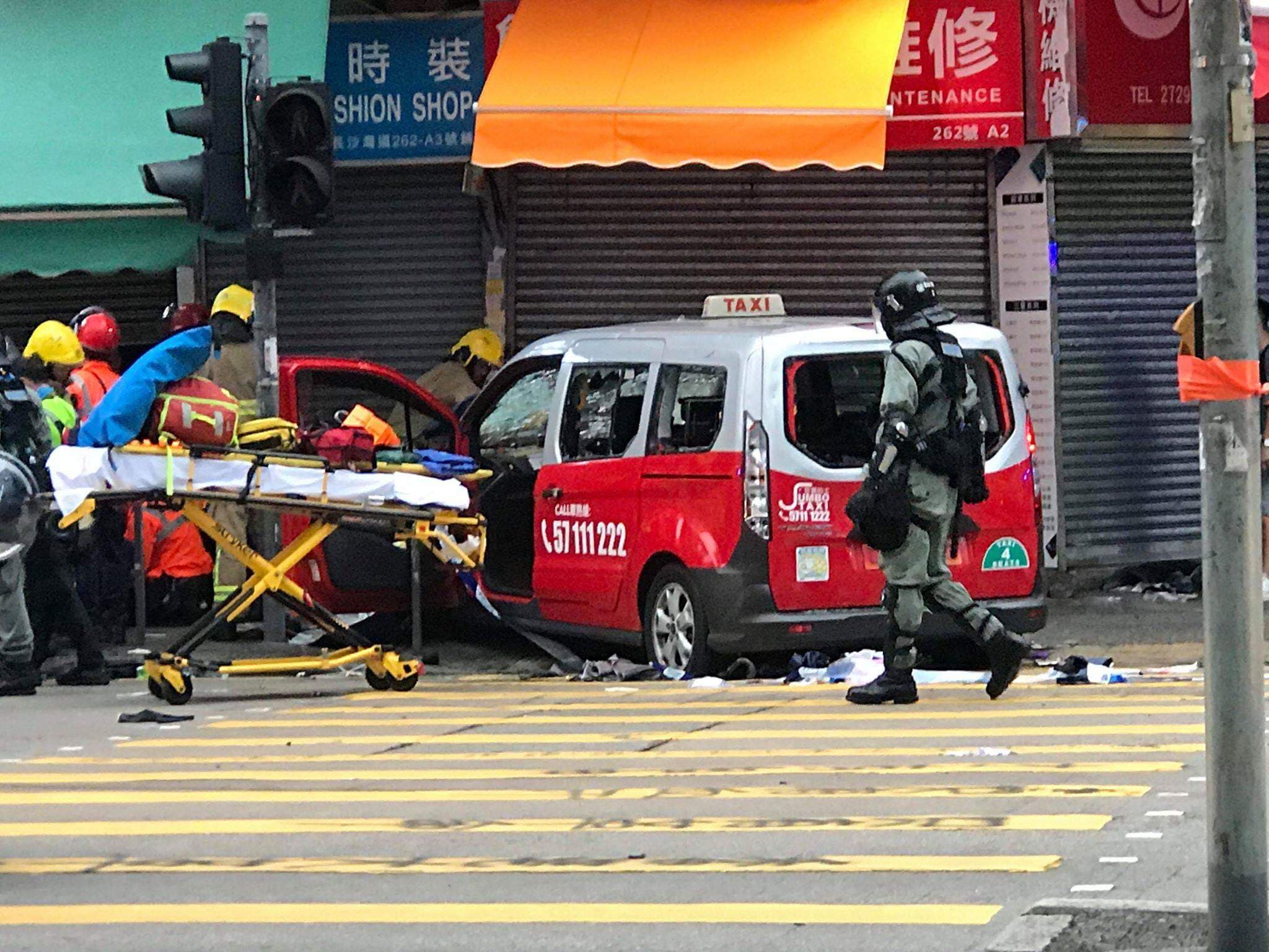上月6日的《禁蒙面法》遊行,一輛的士於深水埗欽州街撞向人群再剷上行人路,一名23歲女子被撞傷,司機即場被私了。