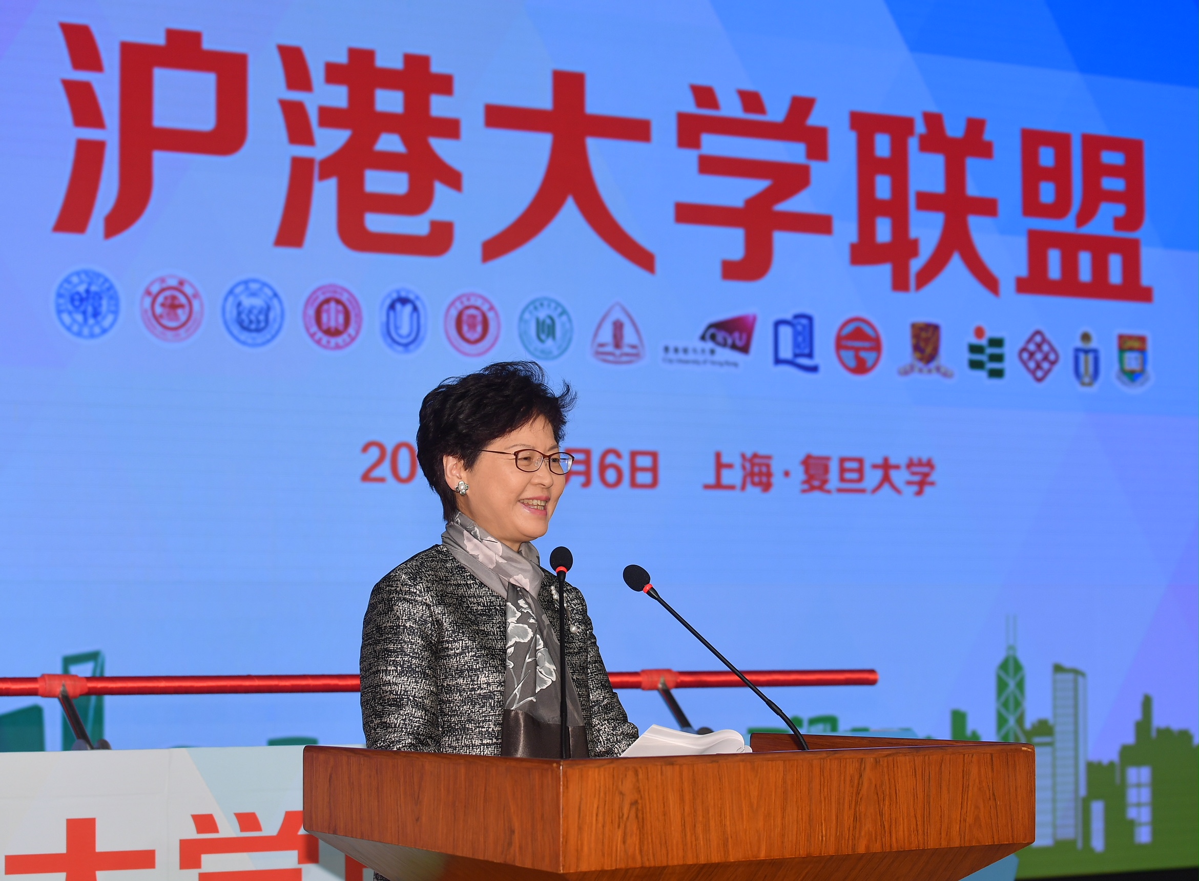 林鄭月娥在政制及內地事務局局長聶德權和行政長官辦公室主任陳國基陪同下,上午出席在復旦大學舉行的「滬港大學聯盟」成立儀式,見證兩地共16所高校結盟。