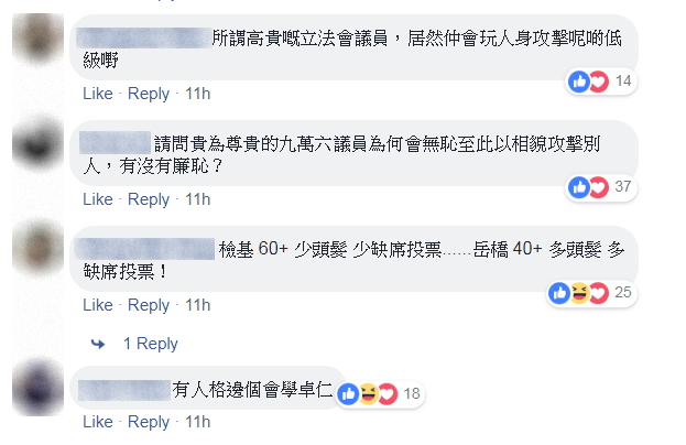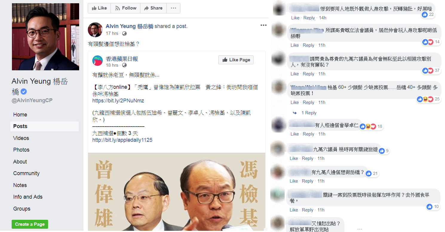 而據稱有為李卓人助選的楊岳橋,則分享報道,並留言「有頭髮邊個想做檢基?」,似是嘲笑馮檢基沒有頭髮。此言甫出,則惹來網民反響,批評楊岳橋人身攻擊,「請問貴為尊貴的議員為何會無恥至此以相貌攻擊別人,有沒有廉恥?」、「你冇嘢呀話?有冇頭髮關你乜事呀」、「所謂高貴嘅立法會議員,居然仲會玩人身攻擊呢啲低級嘢」。