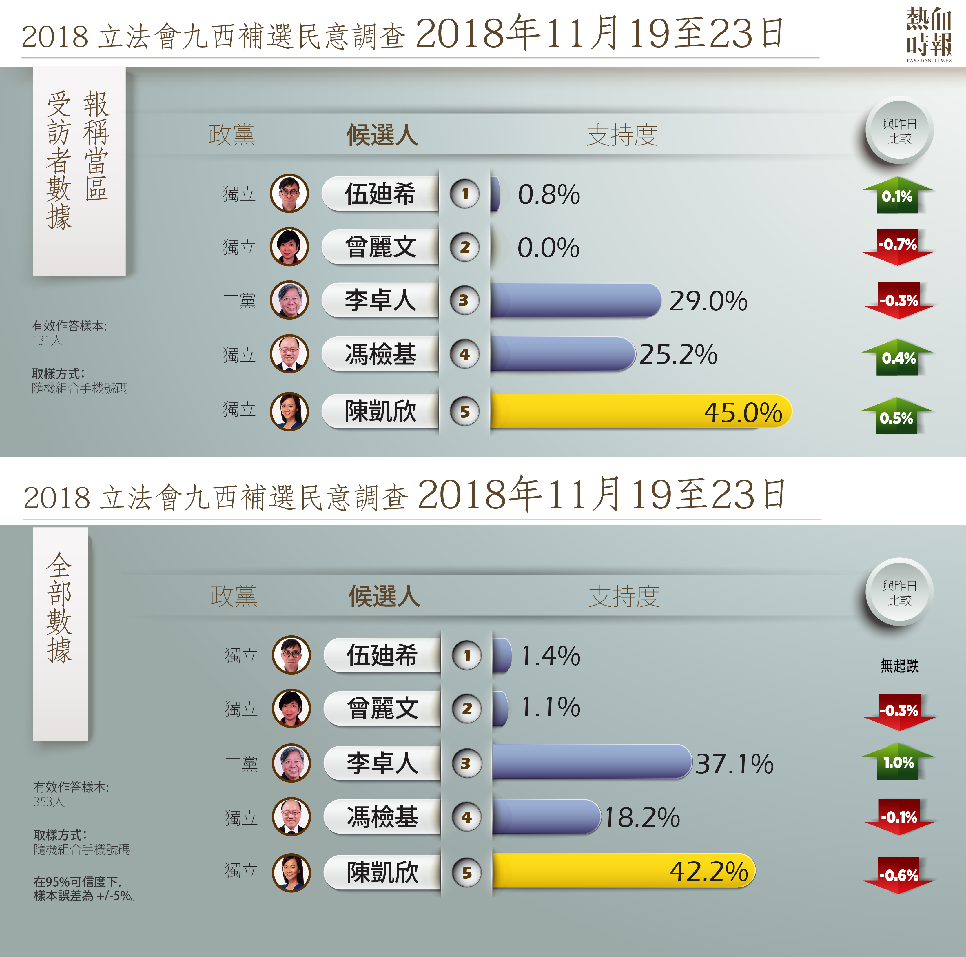 為了解2018年11月25日立法會九龍西地區補選選民的投票意向,反映當前時局,《熱血時報》於2018年11月進行滾動民調,以隨機方式抽選流動電話號碼,進行電話民意調查。