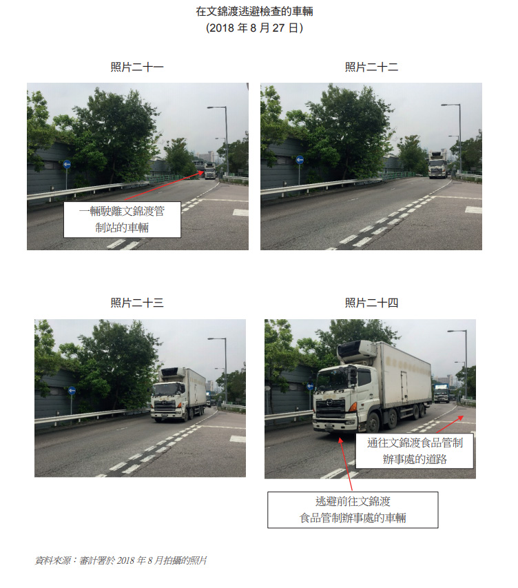 在審計署報告中,有關「陸路進口食物的管制」的部分提到,在2018年8月27日早上,審計署觀察經文錦渡管制站運送貨物進港的車輛,發現約有200輛車駛經文錦渡管制站,其中24輛運載食物批次包括11批蛋類、3批奶類、8批冰鮮家禽和冰鮮鴿,以及2批冰鮮豬肉,須進入文錦渡食品管制辦事處接受食安中心的檢查,但運載蛋類批次的其中4輛,逃避了前往文錦渡食品管制辦事處接受食安中心的檢查。