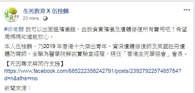 伍桂麟為資深遺體修復師及英國註冊遺體防腐師,全職為醫學院解剖實驗室經理,現任「香港生死學協會」會長。