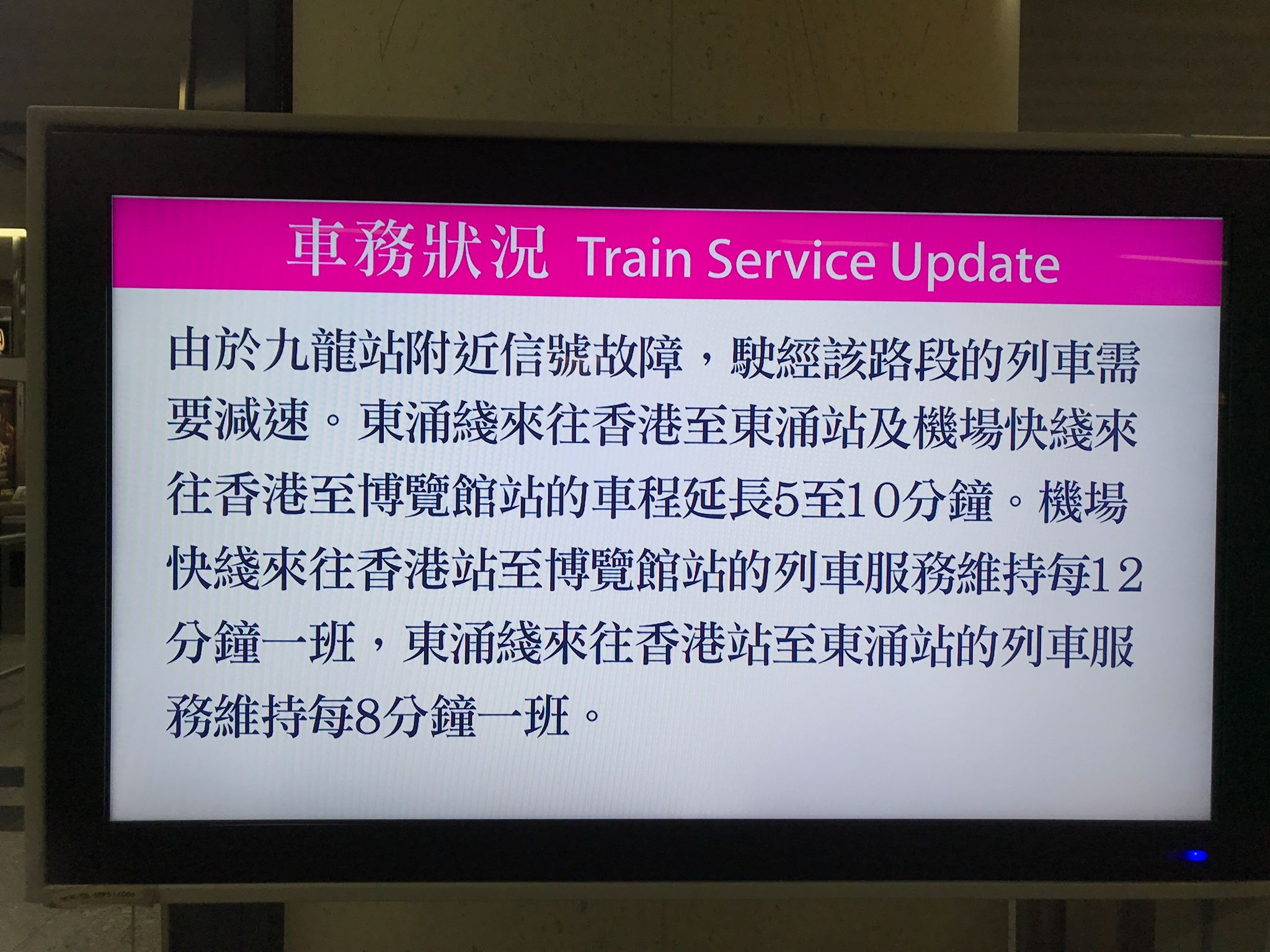 受故障影響,東涌綫列車駛經九龍站至香港站及機場快綫列車駛經九龍站至香港站路段時一度需要慢駛,東涌綫來往香港站及東涌站的行車時間需要額外5-10分鐘,機場快綫來往香港站及博覽館站的行車時間,亦都需要額外5-10分鐘。