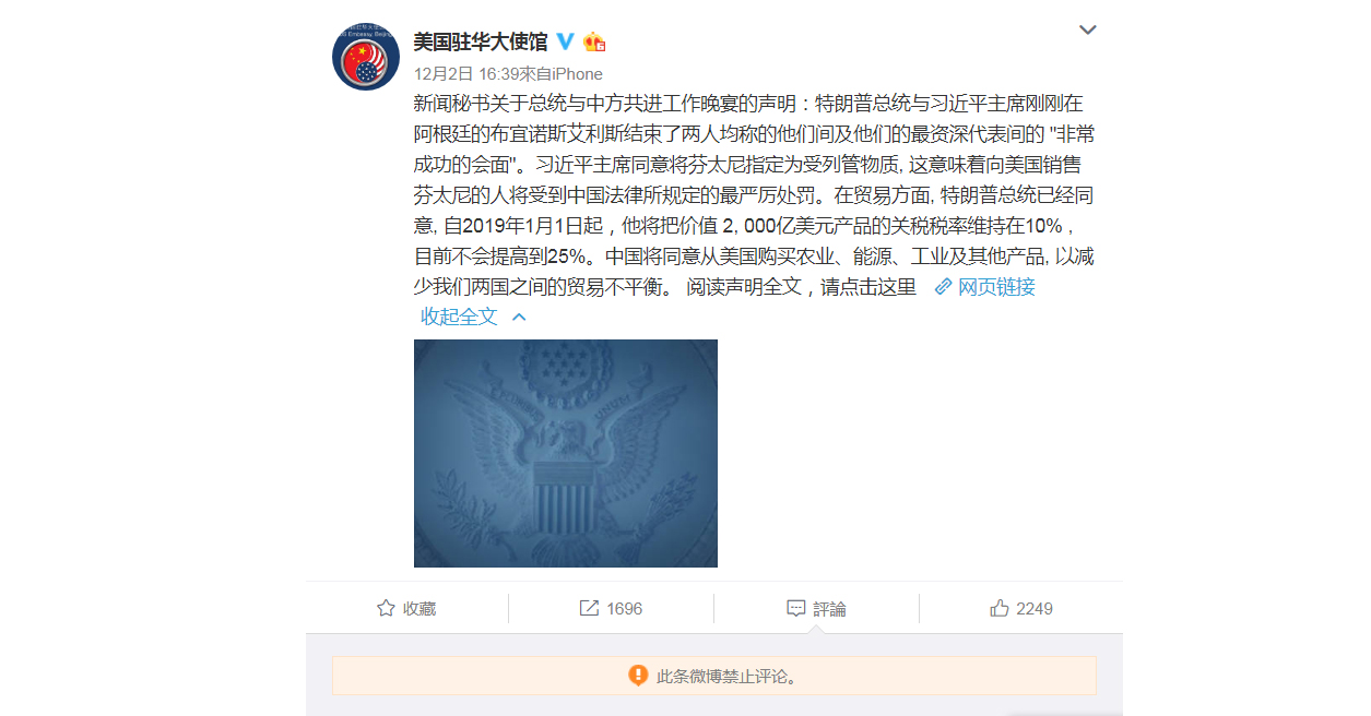 美國總統特朗普與中國國家主席習近平早前在G20峰會進行工作晚宴後,美方發表聲明指二人會面成功,中方同意將芬太尼列為受管物質,以及從美國購買農業、能源、工業及其他產品, 以減少美中兩國之間的貿易不平衡。美國則同意在明年1月1日起,將價值2000億美元中國產品之關稅稅率維持在10% , 暫不提高至25%。
