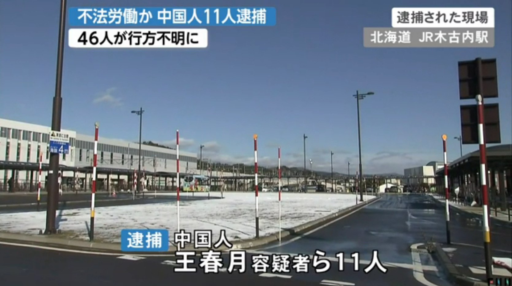 北海道警方昨日(12月3日)公布,11月26日在JR木古內車站附近發現一群中國人形跡可疑,警員上前調查發現眾人未能出示身份證明或已逾期逗留,當場將11名中國籍男女逮捕。據悉11人在今年6月至10月分別從成田機場入境,超過15天短期逗留期限。眾人居於木古內町一座公寓內,其中10人在鄰鎮知内町的太陽能發電工場打工。
