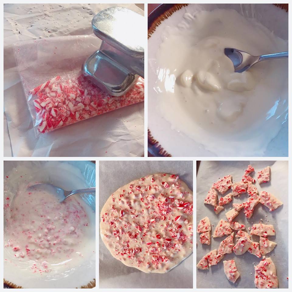 (2)薄荷士的糖白朱古力:先將薄荷士的糖放入密實袋,用鎚仔扑碎,白朱古力以微波爐叮10秒6次,每次拿出來用匙拌勻,再放入微波爐叮,至朱古力完全溶化為止,加入2/3份量的薄荷士的糖拌勻,再倒在已鋪上焗爐紙的焗盤上,用匙將白朱古力推薄,最後撒上餘下1/3份量的薄荷士的糖,放入雪櫃雪硬,然後用手或刀切成喜歡的大小即可備用