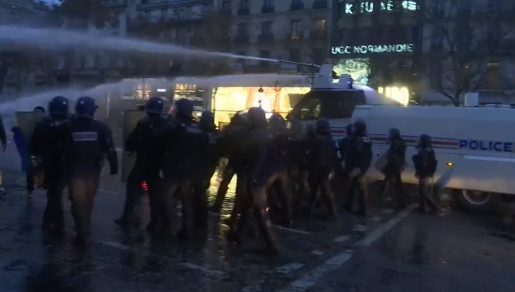在首都巴黎,示威者與警方爆發零星衝突,入夜後仍未散去,警方出動水砲車驅趕,並一度施放催淚彈及胡椒噴霧。