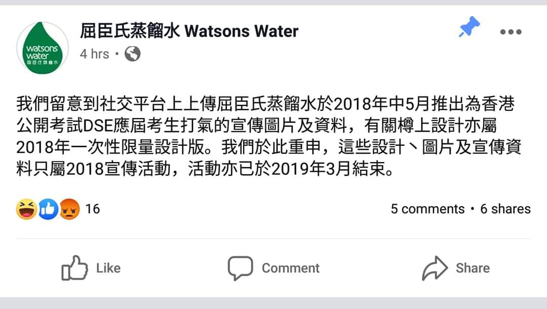 此圖一出,隨即引來黃藍陣營的討論。屈臣氏蒸餾水今日(12月17日)發聲明,指留意到社交平台上上傳屈臣氏蒸餾水於2018年中5月推出為香港公開考試DSE應屆考生打氣的宣傳圖片及資料。